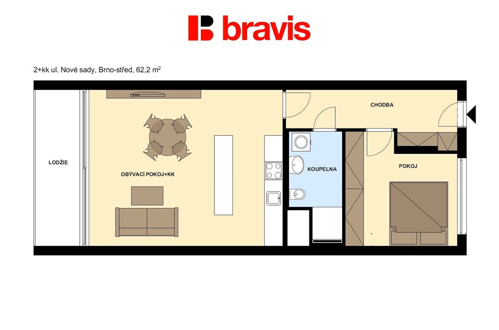 Byt 2+kk o celkové podlahové ploše 62 m2 + lodžie 8 m2 a sklepem se nachází v 6. NP.