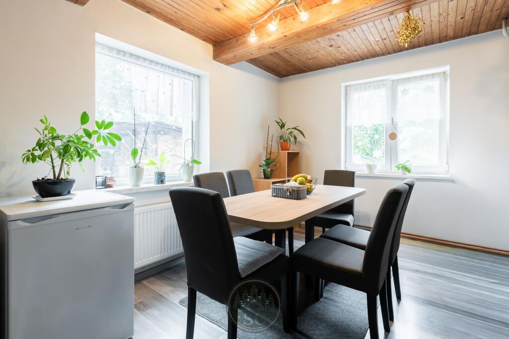 Dispozice domu je promyšlená a útulná. Vstupem se dostanete do předsíně, dále se zde nachází kuchyň s linkou a sporákem, obývací pokoj, ložnice, dvě menší místnosti (jedna slouží jako spíž), zrekonstruovaná koupelna se sprchovým koutem a WC. V kuchyni vynikají krásné stropní trámy, které prostoru dodávají příjemnou venkovskou atmosféru. V podkroví je ložnicová část rozdělená na dva dětské pokoje - i zde jsou dřevěné trámy, které interiéru dodávají osobitý charakter - a další samostatné WC. Ze schodišťové chodby je umožněn přístup na střechu i do půdních prostor.