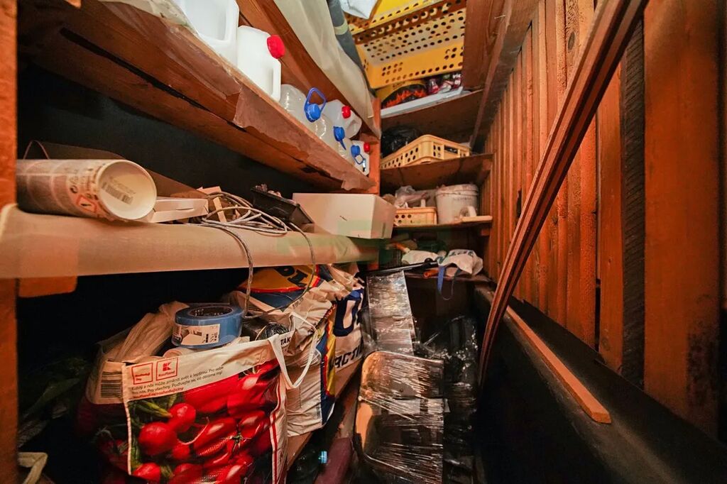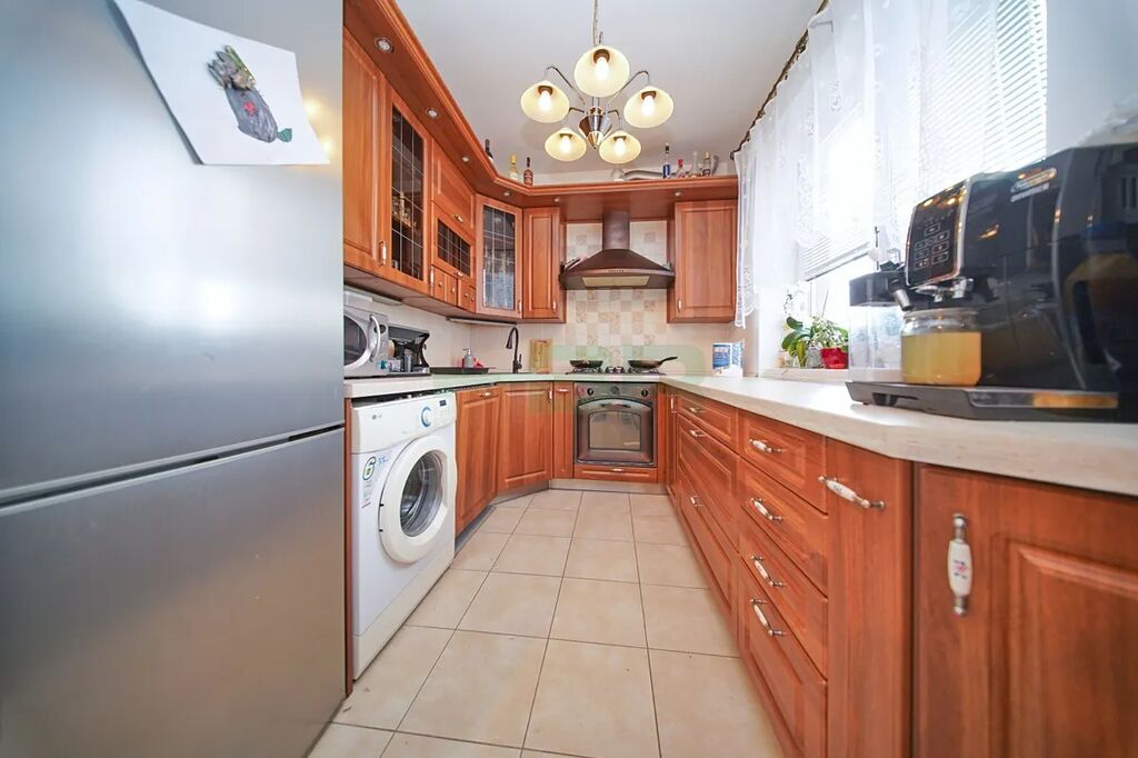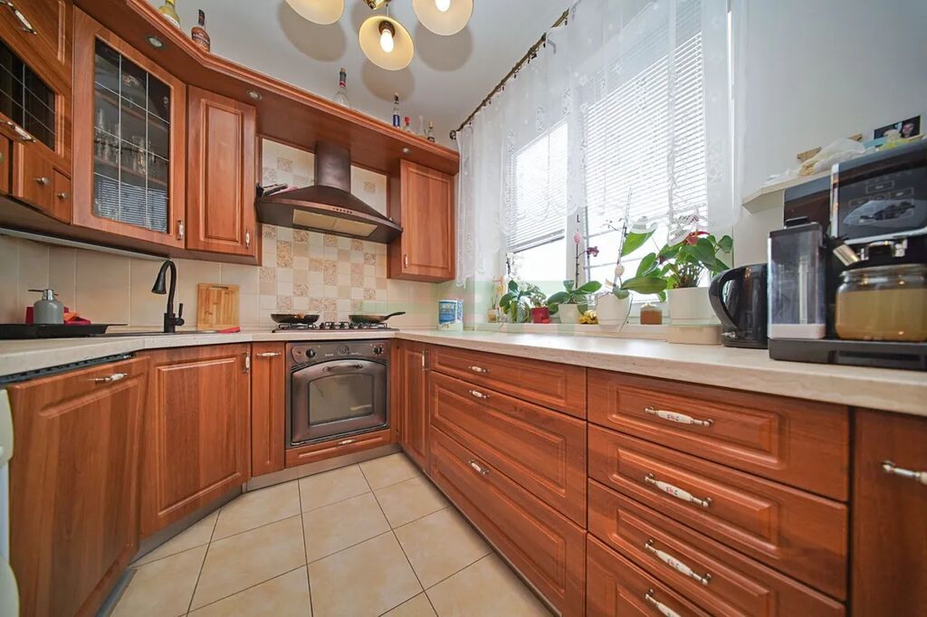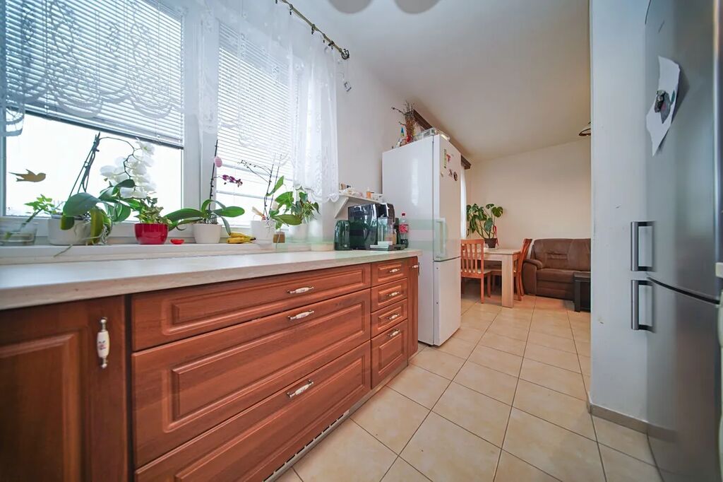 Velká kuchyňská linka se všemi spotřebiči, včetně pětihořákové plynové varné desky. Dále zařízeno třemi šatními skříněmi a botníkem. Ostatní nábytek na fotografiích je ve vlastnictví současného nájemce.
