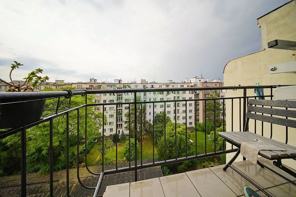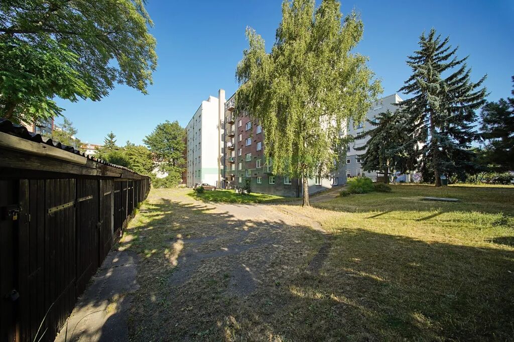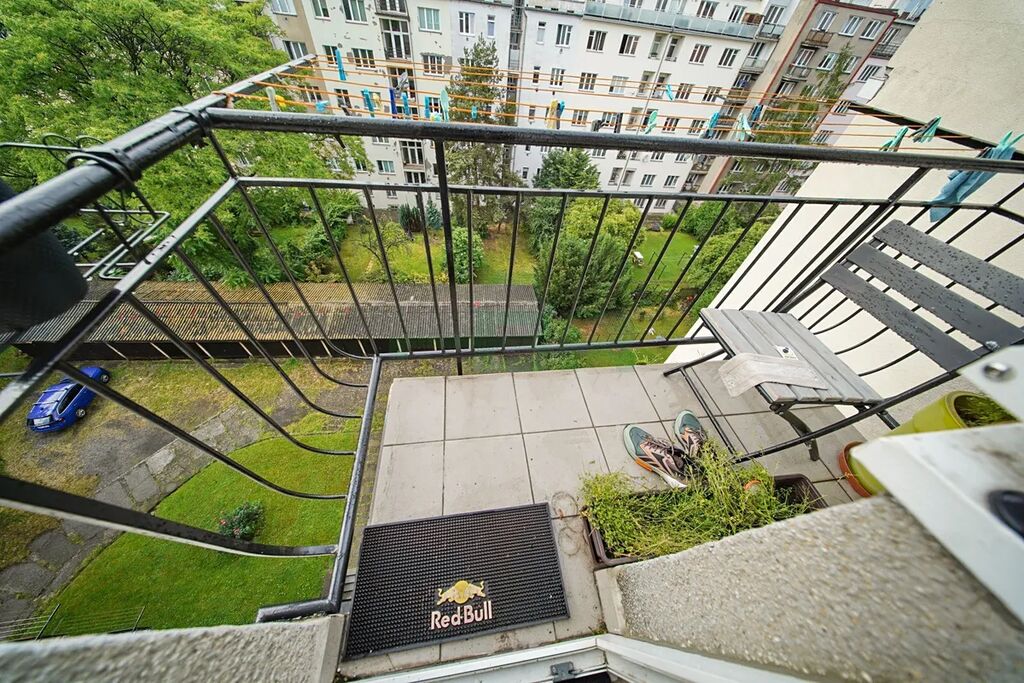 Výhled z balkonu do klidného vnitrobloku s množstvím zeleně.