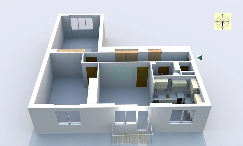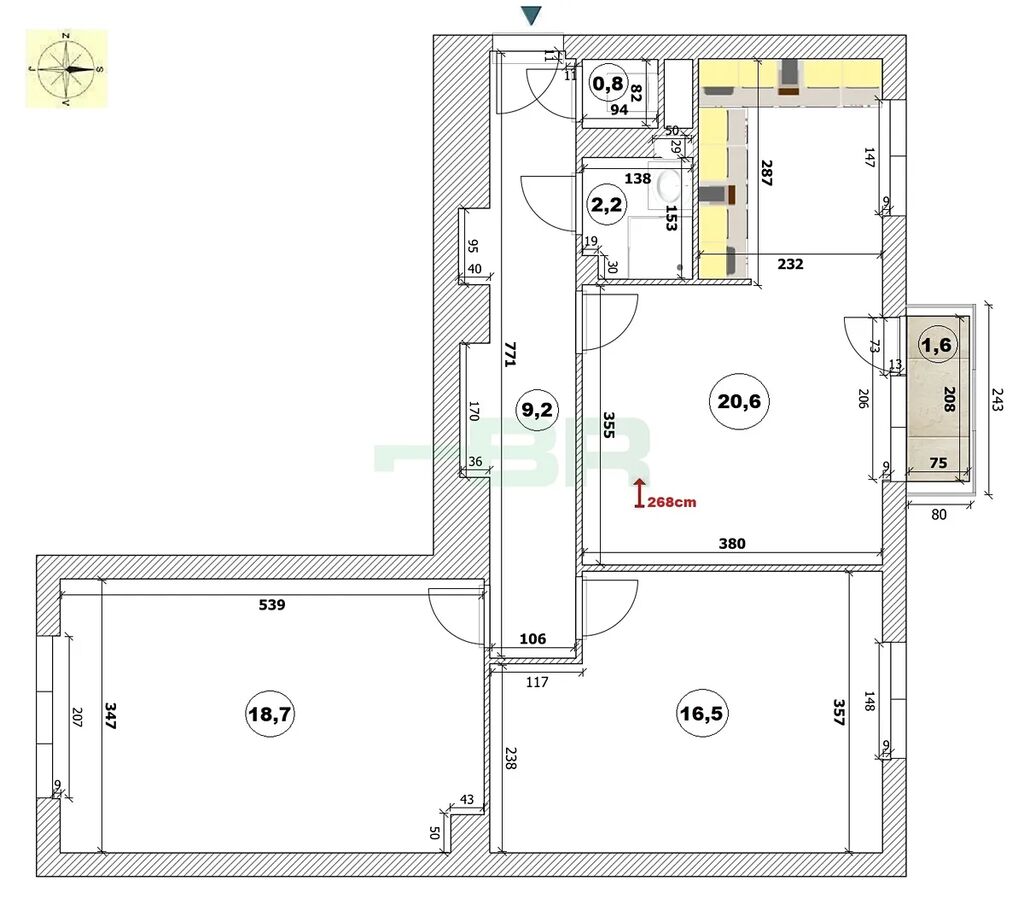 Orientace oken na sever (obývací pokoj, kuchyňský kout, balkon a ložnice) a na jih (druhá ložnice). Kuchyňský kout disponuje velkým oknem. Stropy vysoké 268 cm. Na podlahách dlažba a plovoucí laminátová. Koupelna se sprchovým koutem, WC oddělené – zděné jádro. Ohřev vody elektrickým bojlerem.