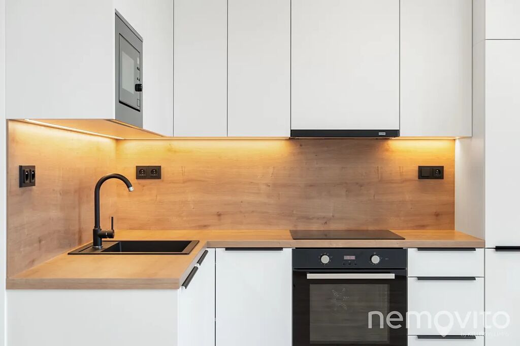 Moderní kuchyňský kout je vybaven vestavnými spotřebiči – varnou deskou, výsuvnou digestoří, horkovzdušnou troubou, myčkou, lednicí s mrazákem a mikrovlnkou.
