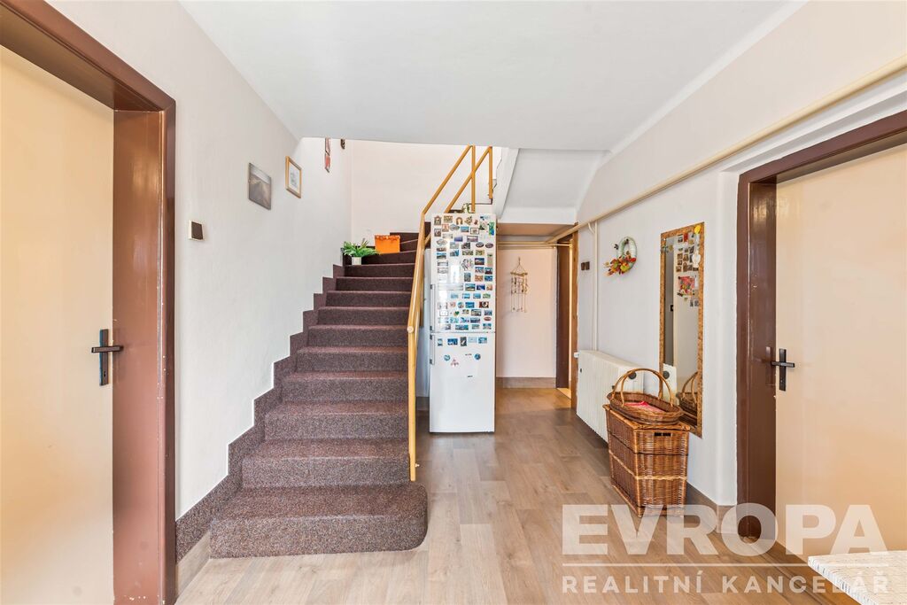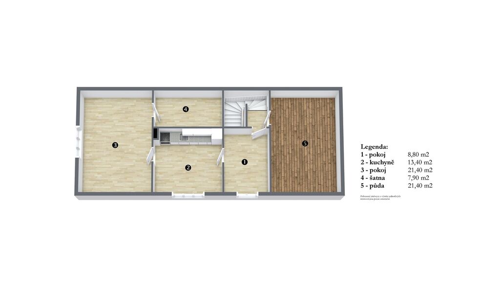 Podkroví nabízí ložnici (8,76 m2), moderní kuchyni s jídelnou (13,39 m2), pokoj s šatnou (33 m2) a prostorný půdní prostor. V domě jsou nová plastová okna a podkroví je zateplené foukaným polystyrenem.