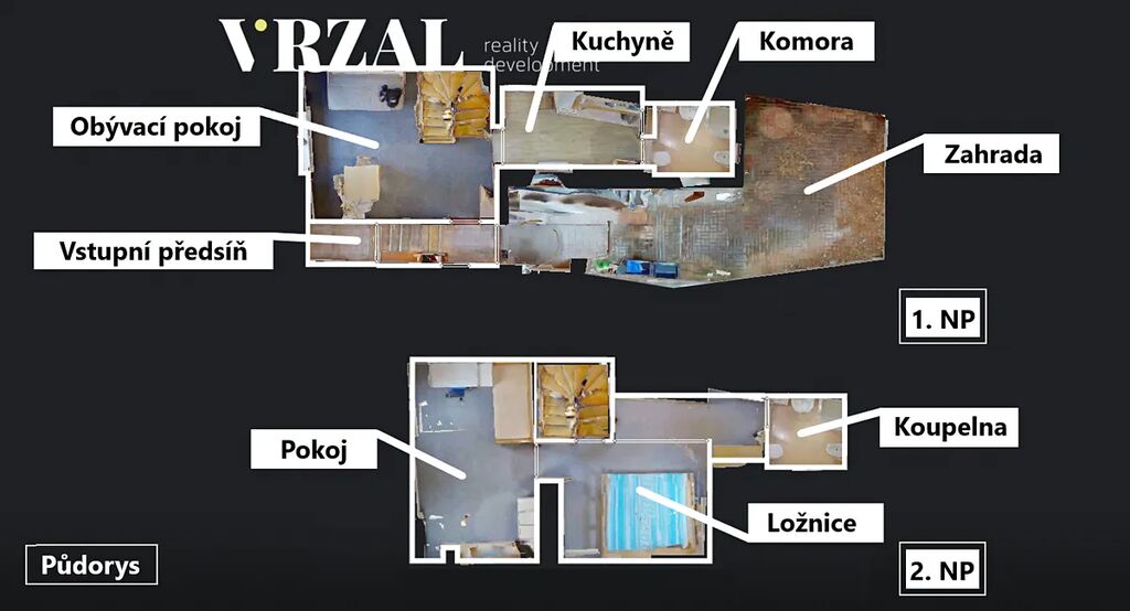 V přízemí se nachází: obývací pokoj, kuchyně, sklad. komora/ toaleta a vstupní předsíň s přístupem do zahrady. V patře je dále k dispozici neprůchozí pokoj, ložnice a koupelna se sprchovým koutem.