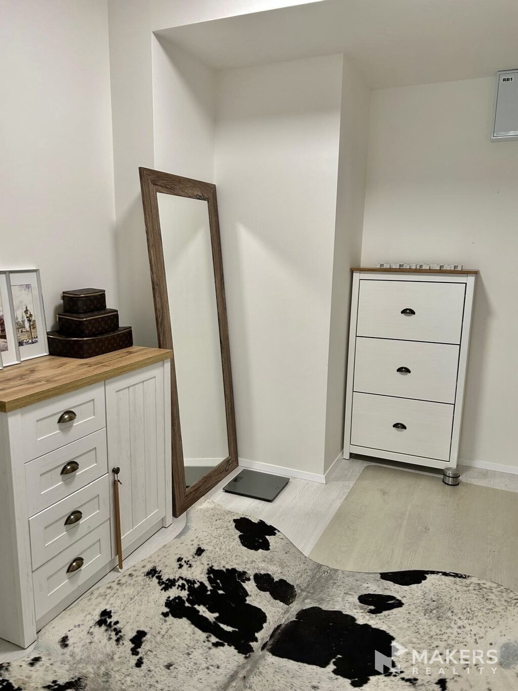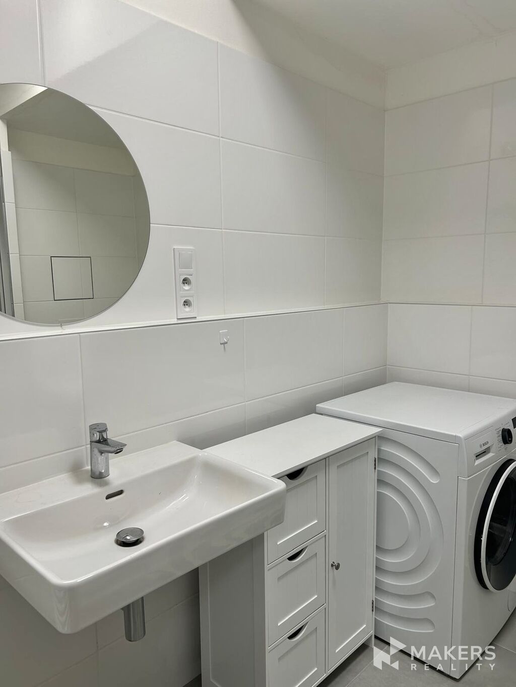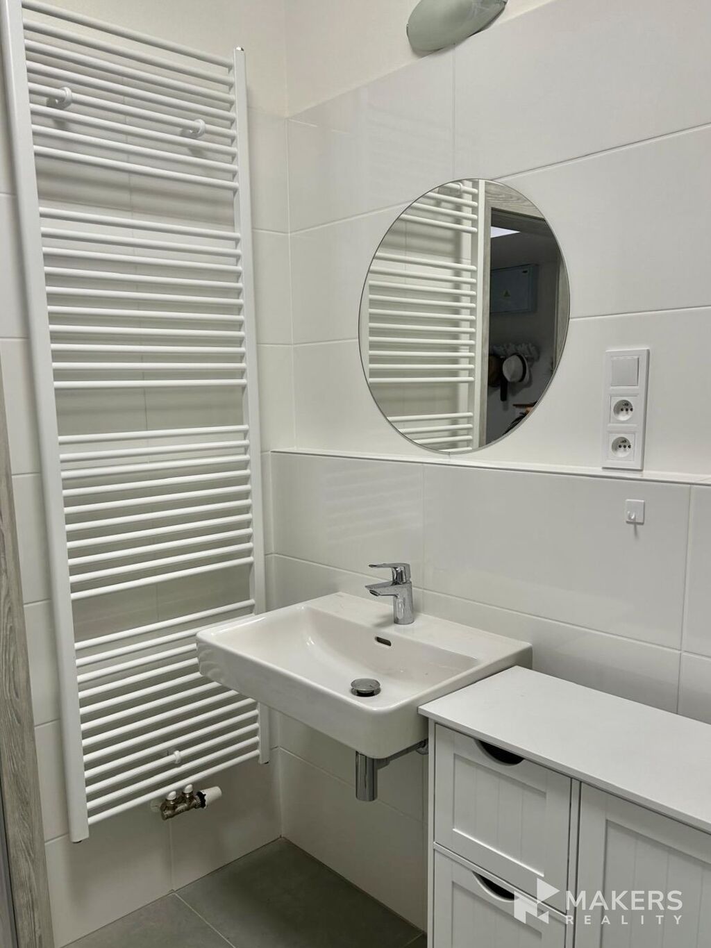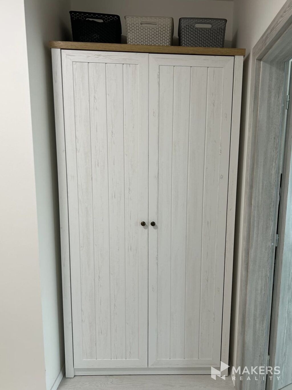 V chodbě se nachází skříň, komoda s několika zásuvkami, zrcadlo v plné výšce a botník, které poskytují dostatek úložného prostoru. Koupelna je vybavena sprchovým koutem, pračkou a úložnými skříňkami. Velkým benefitem je prostorný balkon s posezením a výhledem do zeleně, ideální místo pro ranní kávu nebo večerní odpočinek.
