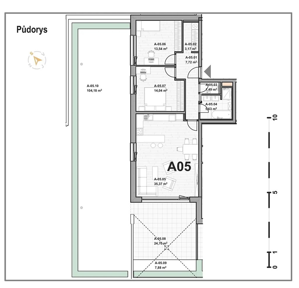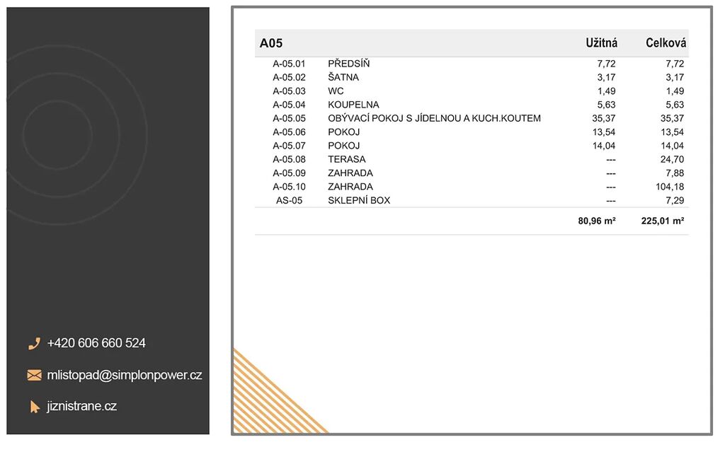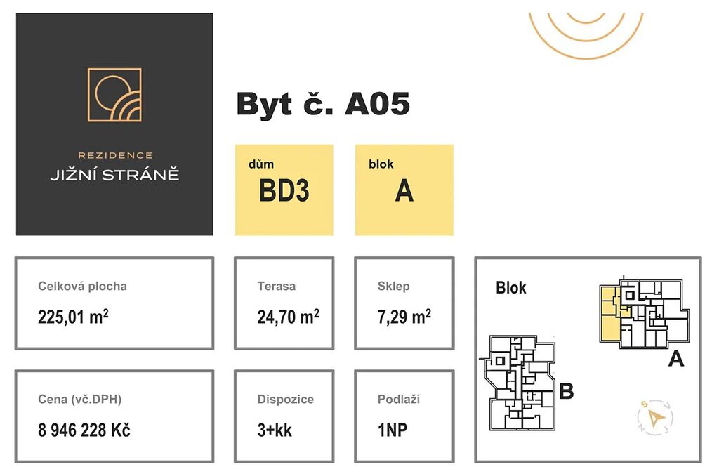 V této druhé etapě vznikne bytový dům BD 3 o dvou blocích A,B propojených suterénním parkovištěm s celkem 36 byty. V rámci této etapy vám nabízíme k prodeji byt 3+kk (označení BD3_A05) s celkovou plochou 225,01 m² (byt 80,96 m², terasa 24,70 m², zahrada 112,06 m² a sklep 7,29 m²).