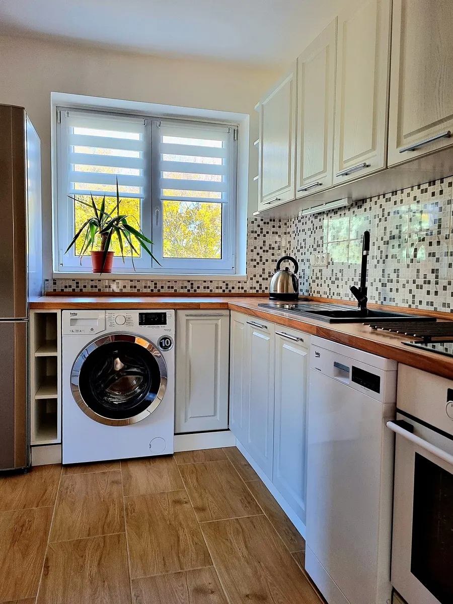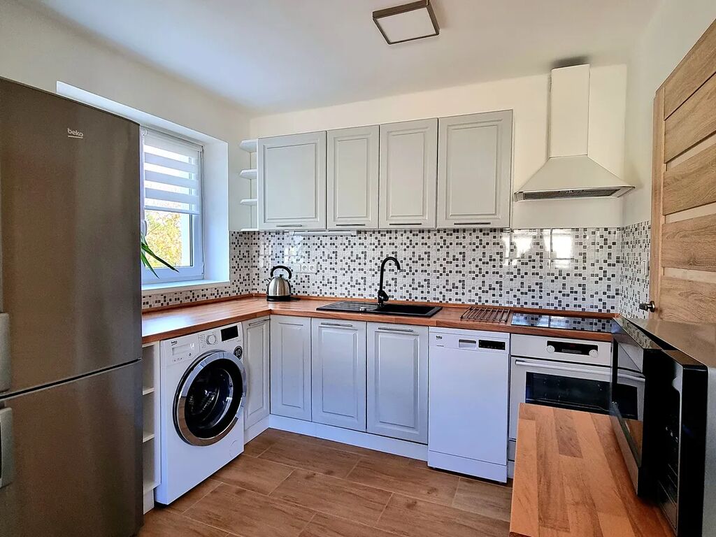 Kuchyně ve tvaru L je vybavena novými, nepoužitými spotřebiči a je otevřená do jídelny, čímž nabízí ideální místo pro rodinná setkání a příjemné chvíle u jídla.