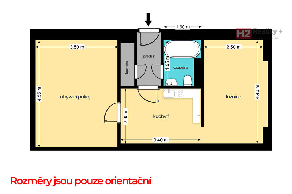Vstup do bytu je malou chodbou, která vede přímo do kuchyně, ze které je samostatný vstup do ložnice i obývacího pokoje (pokoje jsou tedy samostatné a neprůchozí), koupelna (vybavená vanou) je společná s toaletou.