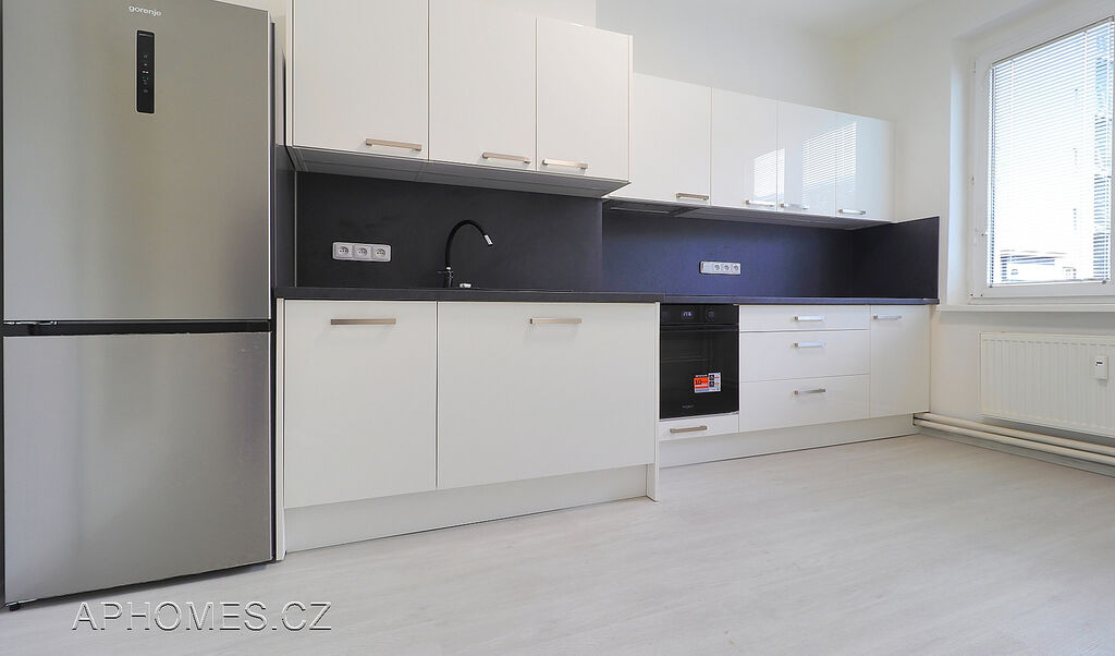 Součástí vybavení bytu je zcela nová moderní kuchyňská linka (vestavěná trouba, digestoř, sklokeramická varná deska, myčka nádobí i lednice.