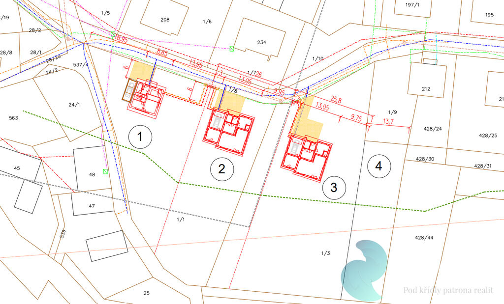Na hranici pozemku se nachází inženýrské sítě – voda, kanalizace, elektřina a plyn.