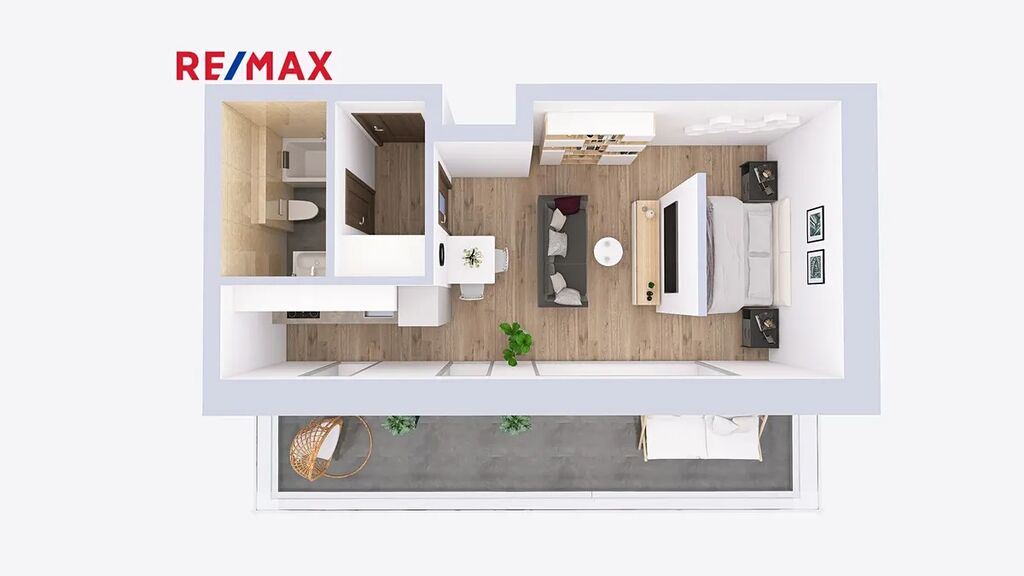 Jedná se o bytovou jednotku 1+kk o podlahové ploše 53 m2 s lodžií (16 m2) ve 2. patře ze 3. NP, orientovanou na JV stranu. Dispozičně je členěna na prostornou obývací místnost s vybavenou kuchyňskou linkou (elektrický sporák, digestoř), chodbu a sociální zařízení. Po celé ploše bytu byla položena plovoucí podlaha a dlažba. Osvětlení je řešeno formou LED světel, které lze regulovat dálkovým ovladačem. Termostatem, který je umístěný v obývací místnosti, lze nastavit teplotu v jednotce.