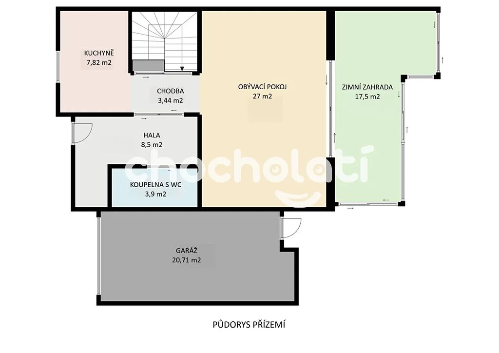 V přízemí je prostorný obývací pokoj na který navazuje prosklená zimní zahrada se vstupem do okrasné zahrady. Kuchyně je řešená jako samostatná místnost. V kuchyni je umístěna kuchyňská linka včetně vestavěných spotřebičů. V přízemí se dále nachází hala, koupelna (po rekonstrukci z roku 2024) se sprchovým koutem a WC.