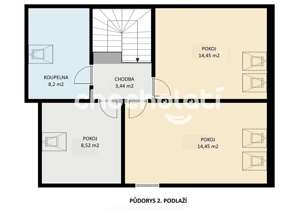 V druhém podlaží jsou 3 samostatné pokoje a koupelna s rohovou vanou.