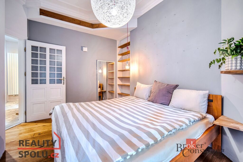 Z obývacího pokoje vede schodiště do spodního patra, kde se nachází chodba s vestavěnými skříněmi, menší pokoj vhodný jako šatna či pracovna, dále dětský pokoj a ložnice se vstupem na střechu. Celý byt je orientovaný do klidného vnitrobloku, což zajišťuje dostatek soukromí a příjemnou atmosféru i uprostřed města.