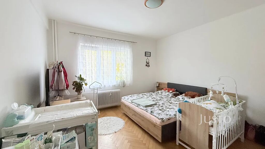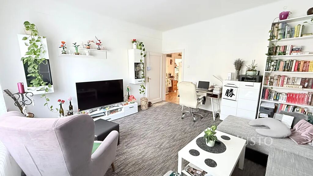 Dispozice bytu nabízí dvě samostatné, světlé a prostorné místnosti, které je možné využít jako obývací pokoj a ložnici. Interiér je v dobrém stavu, čistý a světlý, s plastovými okny a ústředním dálkovým vytápěním. Podlahy jsou tvořeny kombinací koberce a parket, což bytu dodává útulný charakter. K bytu náleží také sklep o velikosti 3 m², který poskytuje dostatek úložného prostoru.
