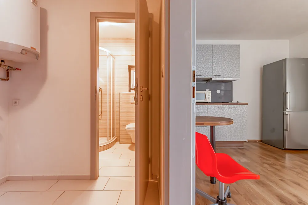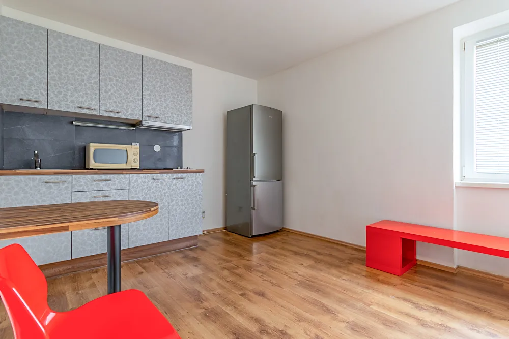 Nabízím vám k pronájmu byt v 5. patře cihlového domu bez výtahu v centru města. Byt je dispozičně řešen jako 1+kk o rozloze 30 m2. Byt není zařízený nábytkem, je tam pouze kuchyňská linka, lednice a vestavěná šatní skříň. Koupelna je moc hezká. Balkon ani sklep nejsou. Veškerá občanská vybavenost je na dosah ruky.