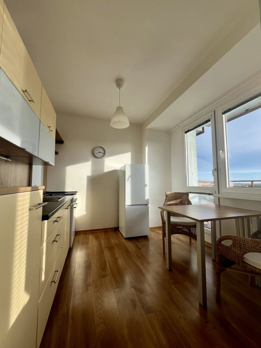 Byt se nabízí plně vybavený. Součástí kuchyňské linky je elektrická trouba a plynový sporák, lednice a jídelní stůl se dvěmi židlemi. Z kuchyně se také dostaneme na balkon.