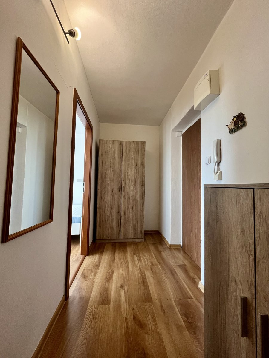 K dlouhodobému podnájmu nabízíme slunečný byt o dispozici 1+1 o celkové výměře 37 m2 se nachází v devátém podlaží panelového domu. K bytu náleží také sklep a balkon.