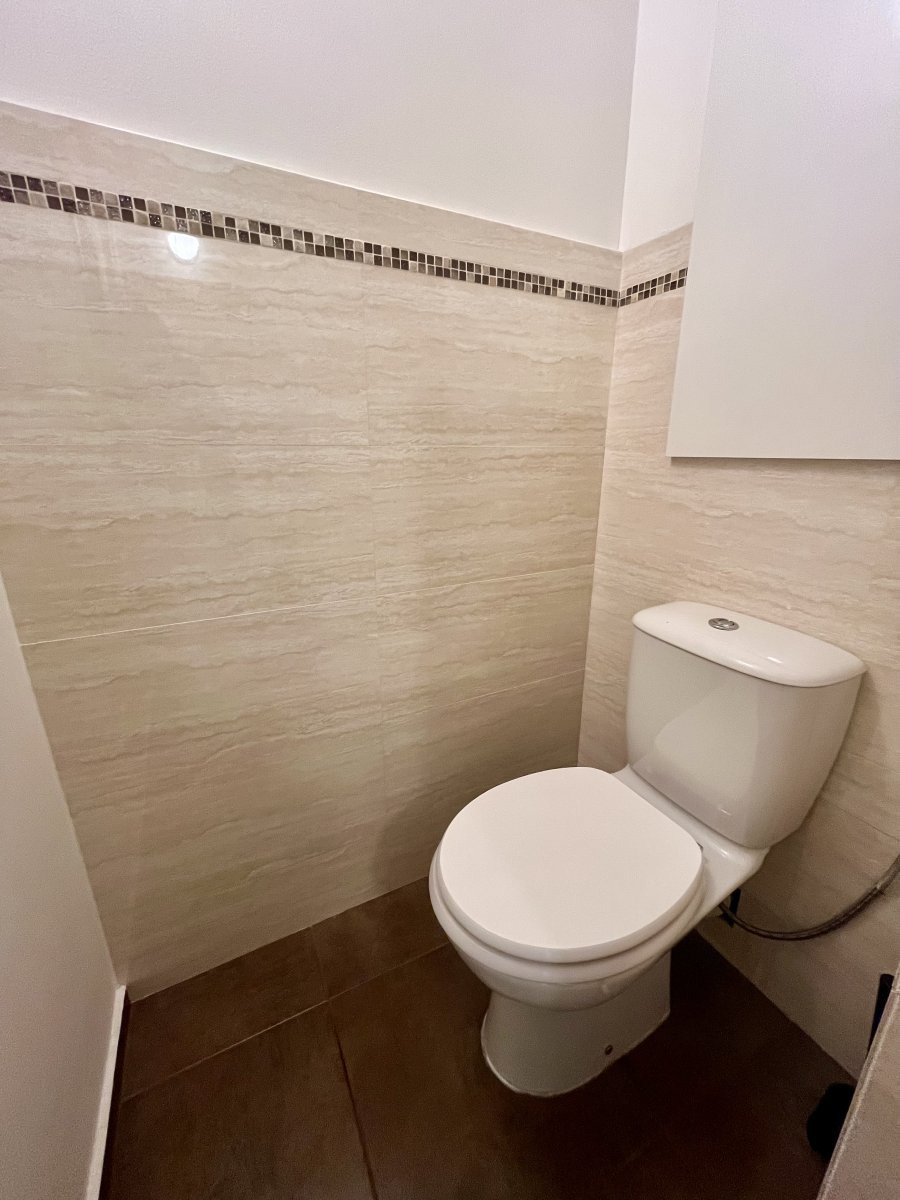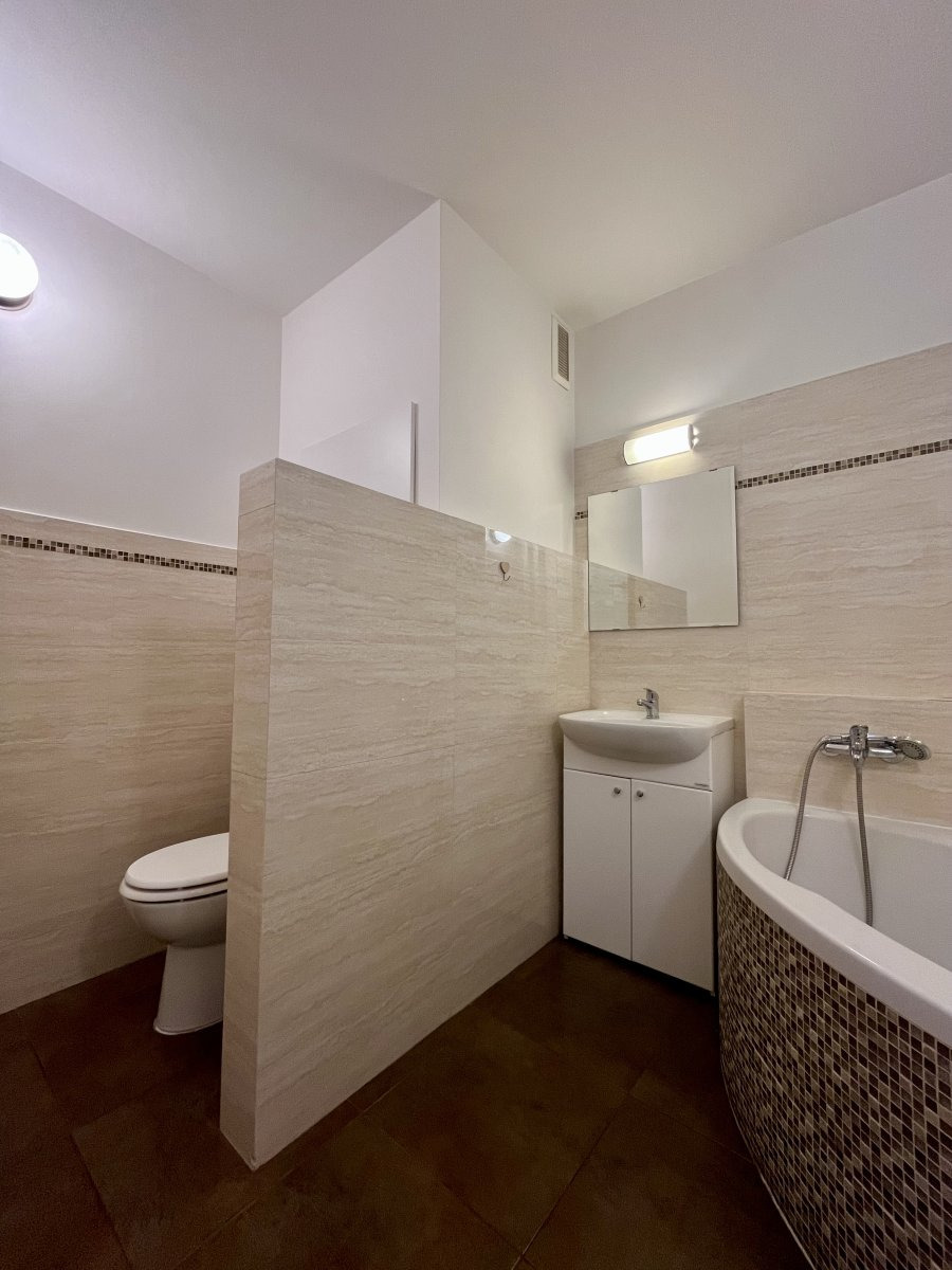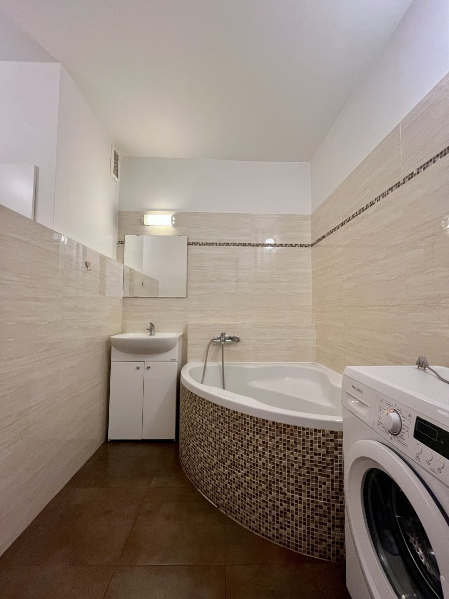 Koupelna disponuje vanou s umyvadlem a skříňkou a pračkou. Za zástěnou je umístěna toaleta.