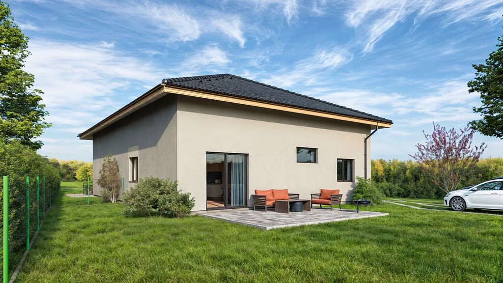 Z obývacího pokoje výjdete francouzskými dveřmi dostanete na vlastní oplocenou zahradu s terasou. Dům se nachází v nové lokalitě obklopující se novou výstavbou rodinných domů.