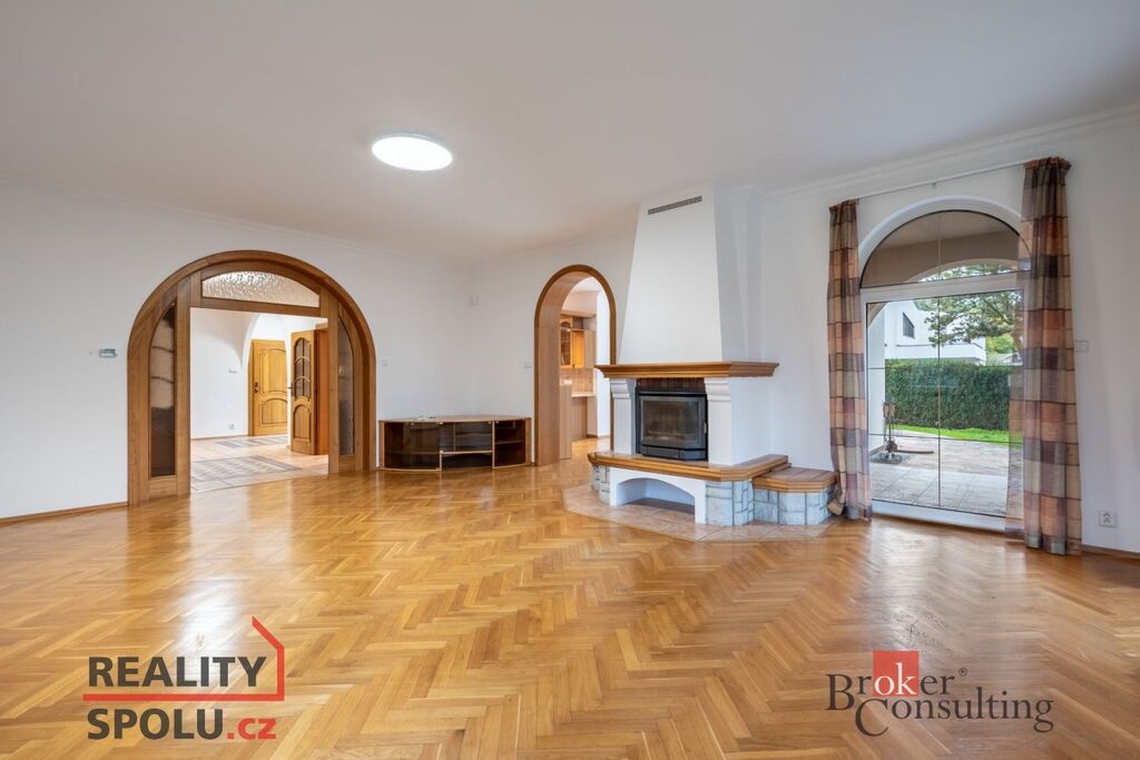 Nabízíme k pronájmu prostornou a reprezentativní vilu o užitné ploše 369 m², postavenou v roce 2006. K vile náleží terasa o ploše 88 m², garáž pro dvě auta (35 m²) a zahradní domek cca 30 m². Celková rozloha pozemku přesahuje 1 000 m².