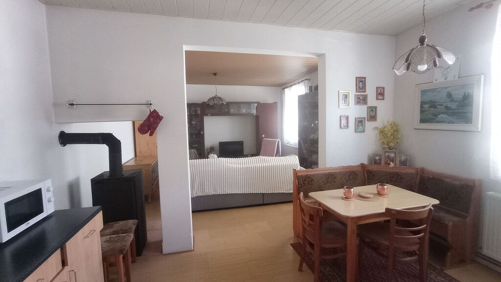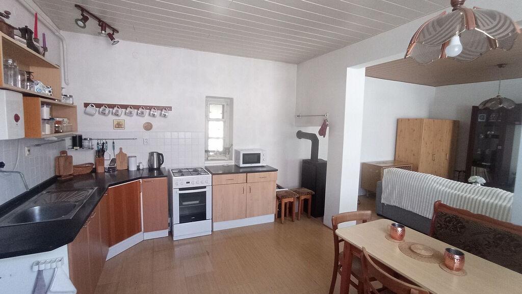 Dům disponuje prostornou kuchyní s jídelnou, která je spojená s prostorným obývacím pokojem, ložnicí a koupelnou se sprchovým koutem.