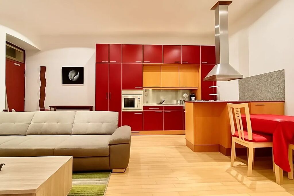 Byt je kompletně zařízen, včetně veškerých spotřebičů – myčky, trouby, varné desky, lednice i pračky.