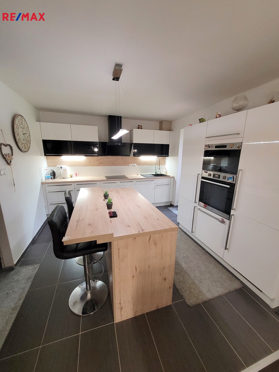 • Přízemí: Srdcem domu je velký obývací pokoj, který je propojen s plně vybavenou kuchyní, jež nabízí dostatek prostoru pro přípravu rodinných obědů i večeří s přáteli. V přízemí dále najdete technickou místnost a koupelnu se sprchovým koutem a toaletou.