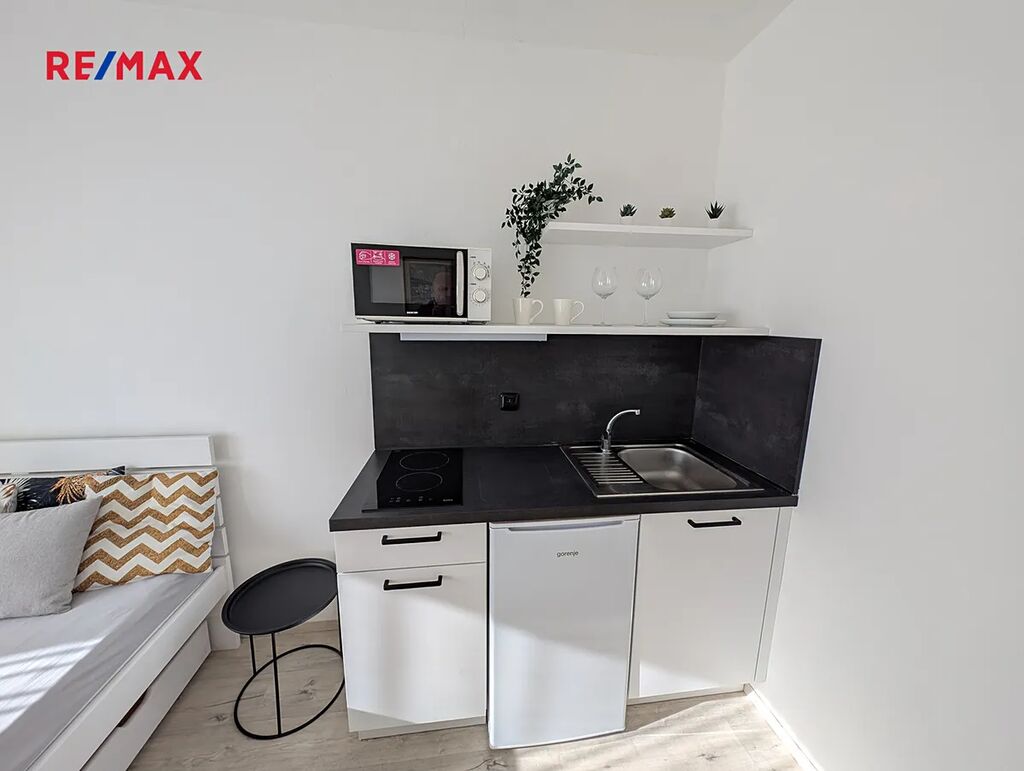 Hlavní místnost kombinuje obytný prostor s kuchyňským koutem (varná deska, mikrovlnka, lednice). Součástí vybavení je lůžko, jídelní stůl, komoda a konferenční stolek. Koupelna se sprchovým koutem a WC; pračka a sušička jsou k dispozici ve společném prostoru domu.