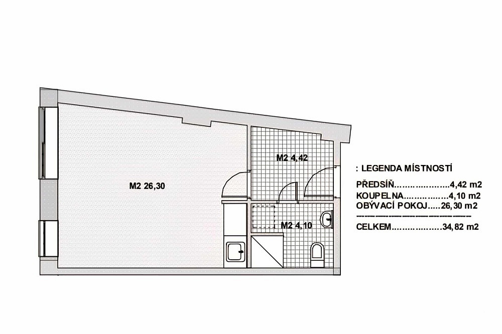 Dispozice: pokoj s kuchyňským koutem o ploše 26,30 m², prostorná předsíň 4,42 m², koupelna se sprchovým koutem společná s WC 4,10 m².