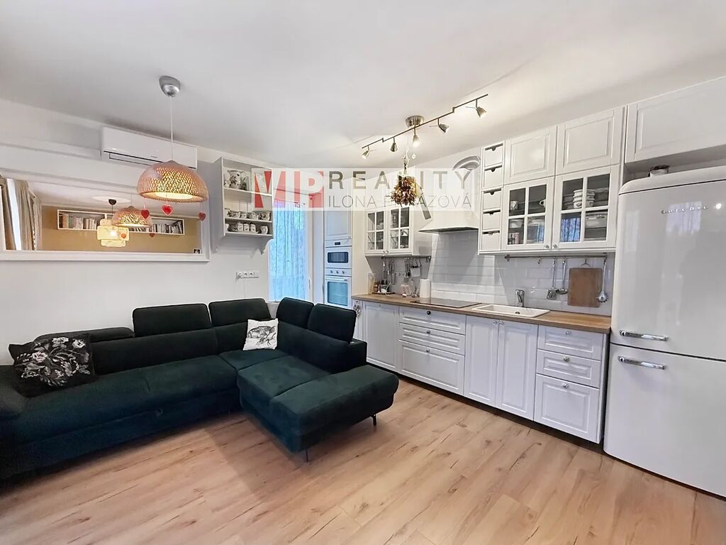 -Obývací pokoj je propojen s moderní kuchyní a má přímý vstup na zahradu i na prostornou lodžii.