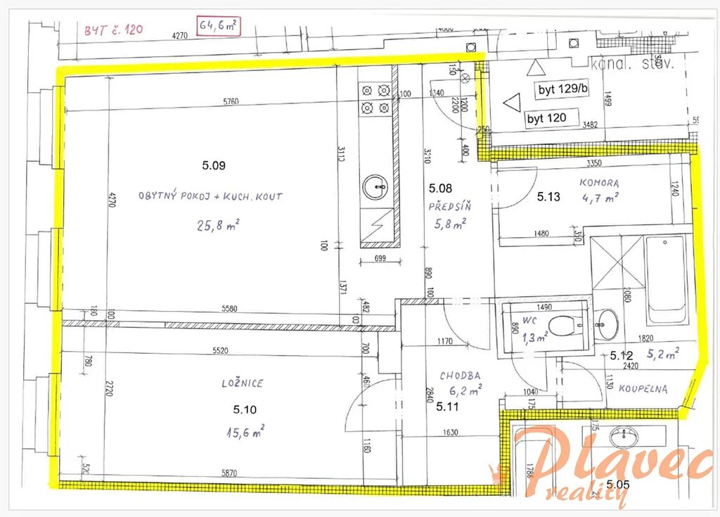 Dispozice: předsíň (5,8 m2), chodba (10 m2), kuchyň (6,2 m2), ložnice (15,6 m2), obývací pokoj s kuchyňským koutem (25,8 m2), koupelna s vanou, sprchovým koutem a umyvadlem (5,2 m2), toaleta (1,3 m2), komora (4,7 m2).