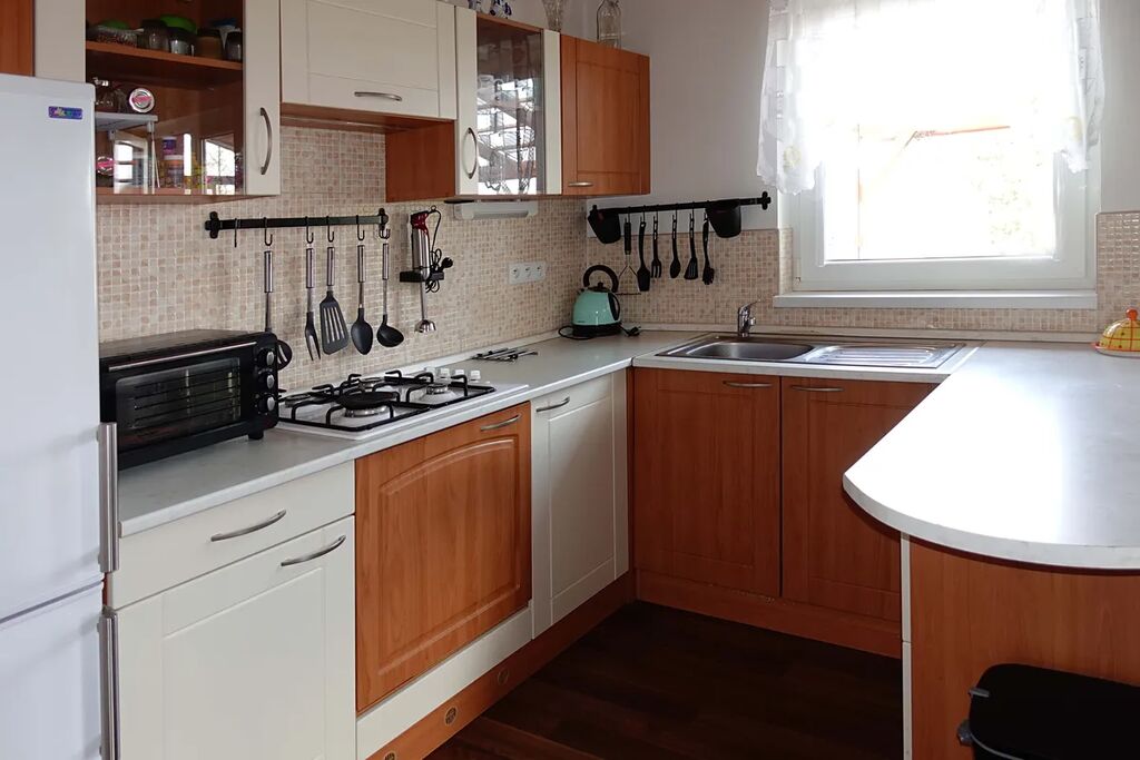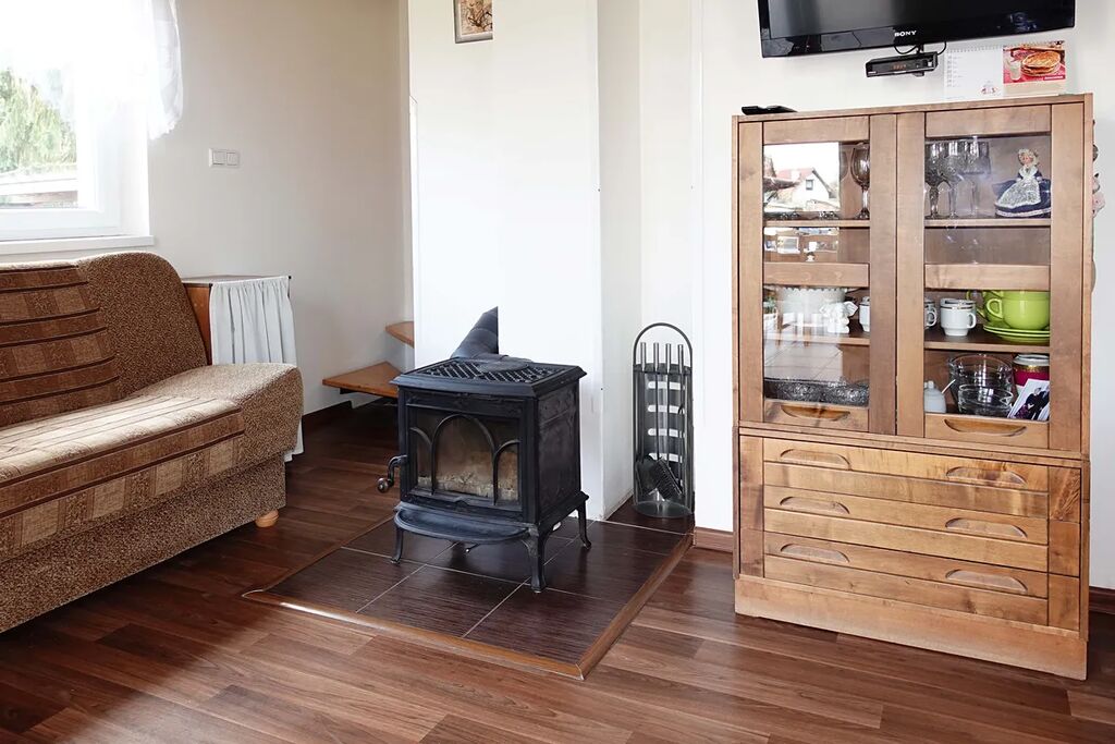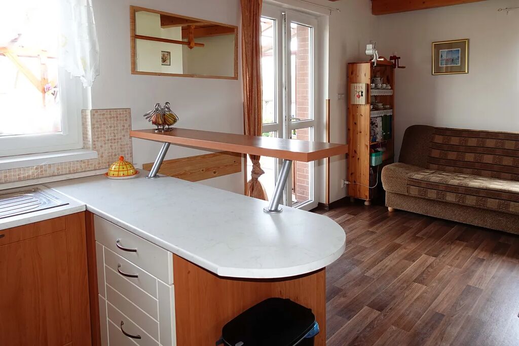 Chata je částečně podsklepena, v přízemí je obývací pokoj s kuchyní a v patře dvě ložnice. K dispozici je zastřešená terasa s posezením. Voda je z vlastní studny, ohřev teplé užitkové vody elektrickým bojlerem, WC a sprchový kout (odpad do septiku), vytápění lokální krbovými kamny. Parkování v krytém stání před chatou.