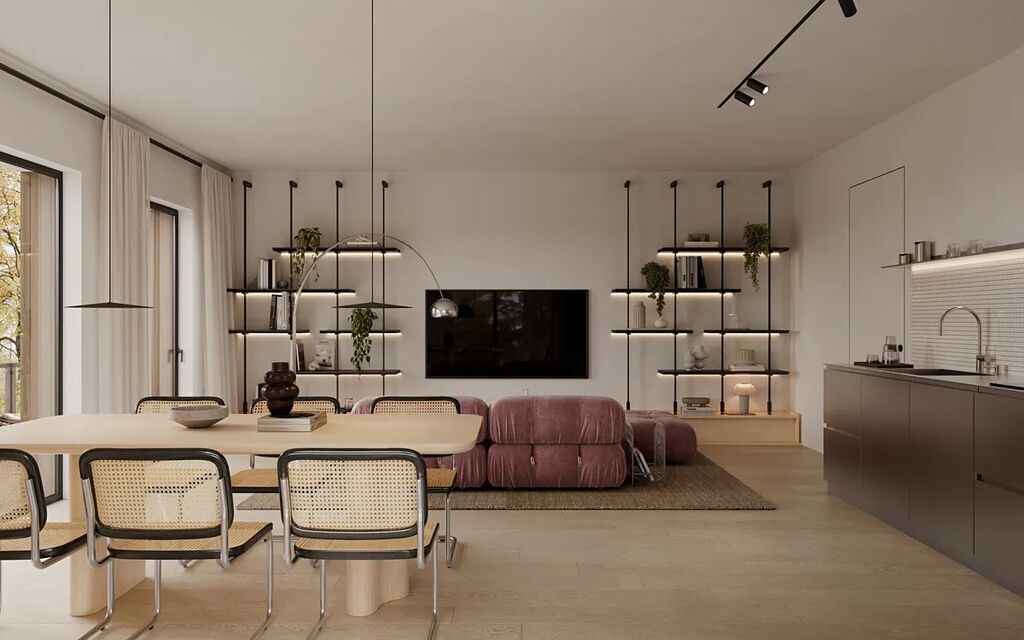 Byt disponuje podlahovým vytápěním, rekuperací, nadstandardní světlou výškou stropu 2,8 m, dřevěnými podlahami a SMARTHOME technologií od společnosti Loxone. Ke každému bytu náleží balkon, terasa nebo předzahrádka a sklepní kóje. Parkovací stání v podzemní garáži je možné dokoupit, včetně místa s wallboxem pro elektromobil. Projekt využívá solární panely, což výrazně snižuje provozní náklady bytového domu a podporuje udržitelný způsob bydlení. Pro tuto nemovitost byly vytvořeny 3D fotorealistické vizualizace přesně podle projektové dokumentace.