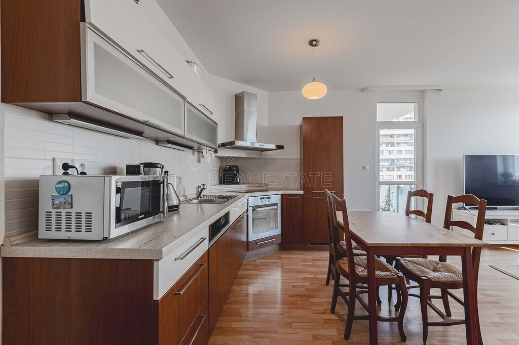 Nabízený byt je částečně zařízený a vhodný pro pohodlné bydlení: kuchyňská linka včetně spotřebičů, myčka, pračka. Vybavení zahrnuje moderní kuchyňský kout s obývacím pokojem a vstupem na balkon, oddělenou ložnici se vstupem na balkon a samostatné WC a koupelnu.
