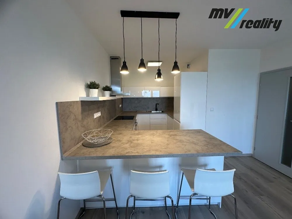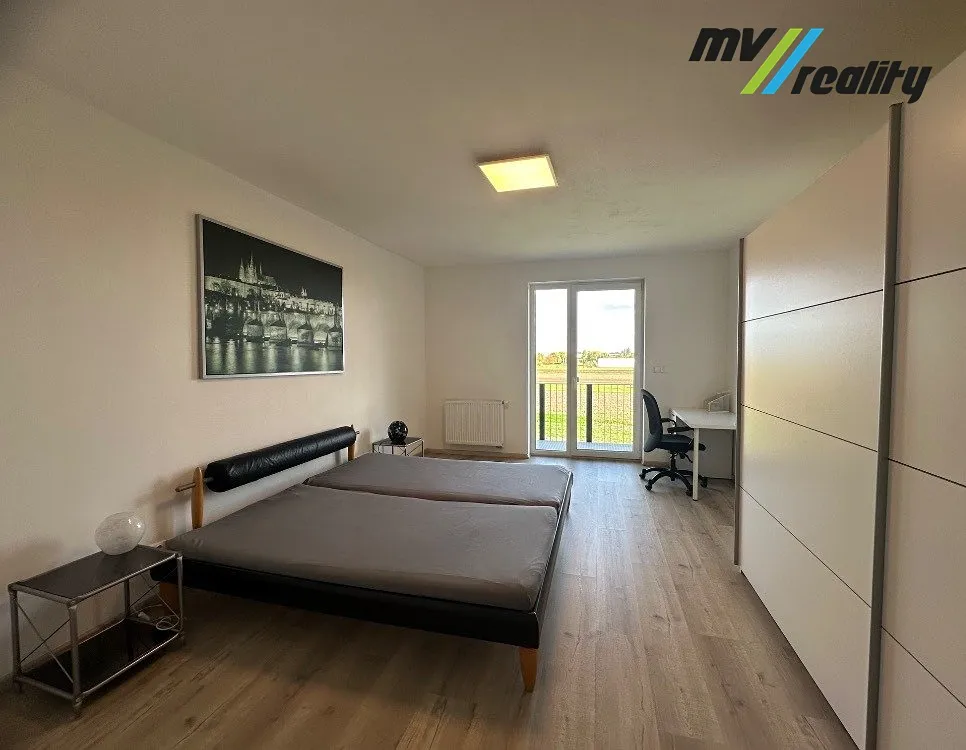 Byt je velmi světlý a nabízí krásný výhled do okolních polí. Dispozice bytu - prostorný obývací pokoj s moderní kuchyňskou linkou vybavenou spotřebiči, samostatná ložnice, koupelna se sprchovým koutem a toaletou a vstupní chodba. Byt se pronajímá zařízený – včetně veškerého nábytku a spotřebičů (viz foto), stačí se jen nastěhovat.
