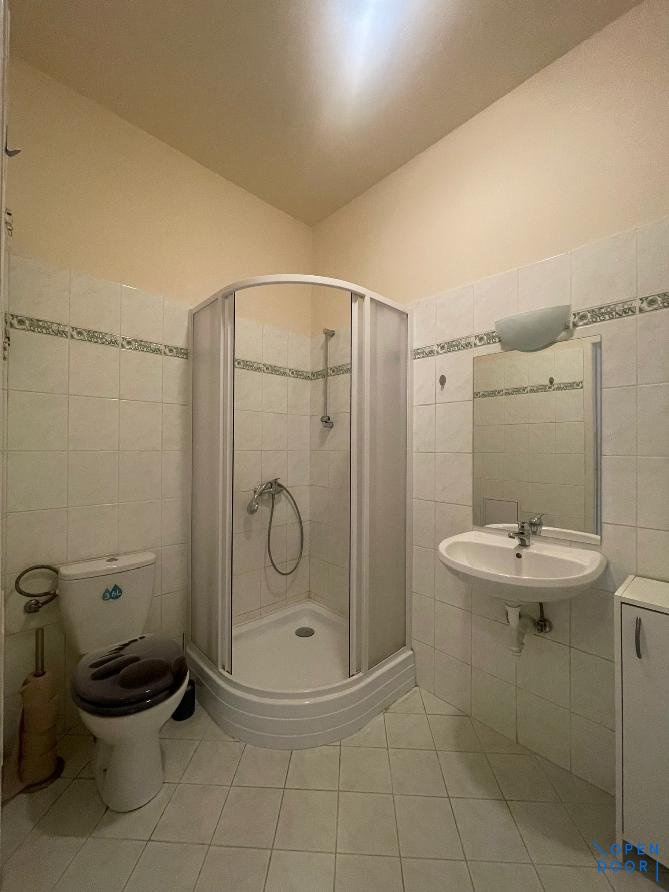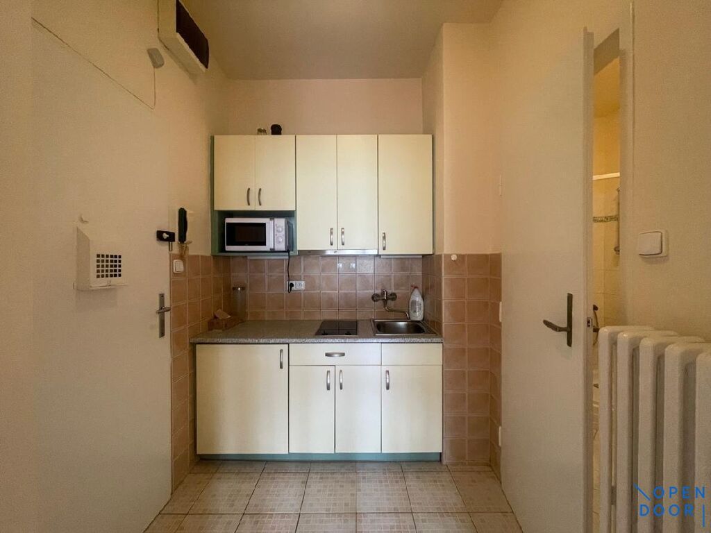 Prostorný pokoj s repasovanou parketovou podlahou a s výhledem do klidného vnitrobloku je vybaven velkou šatní skříní, v předsíni je instalována kuchyňská linka s lednicí a dvou plotýnkovou elektrickou varnou deskou. Koupelna je se sprchovým koutem, má přípojku na pračku a úložné skříňky. WC v koupelně.
