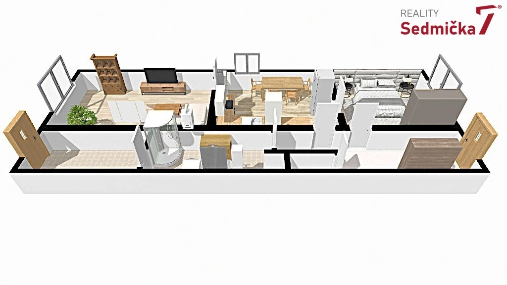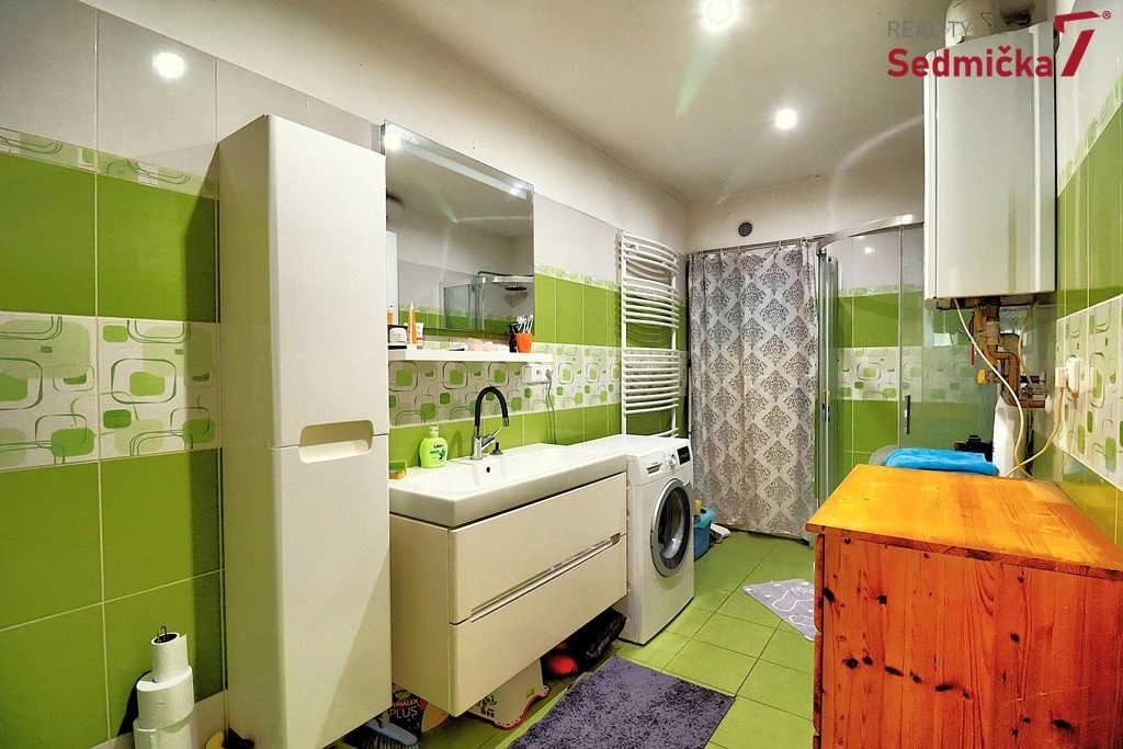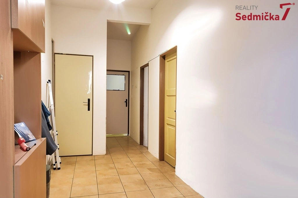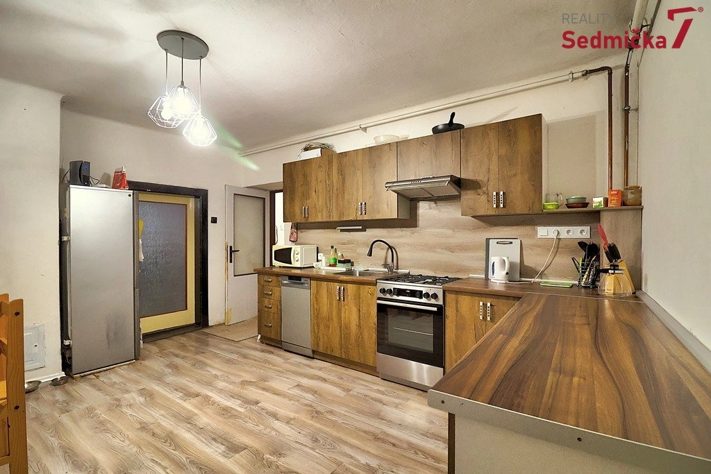 V domě je prostorná předsíň se vstupem do pokoje, kuchyně, koupelny s WC a na půdu. Z kuchyně je přístup do velkého obývacího pokoje s výhledem do zahrady. Dům je částečně podsklepený s možností půdní vestavby.