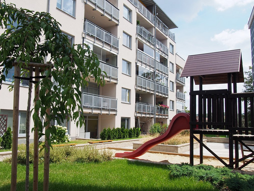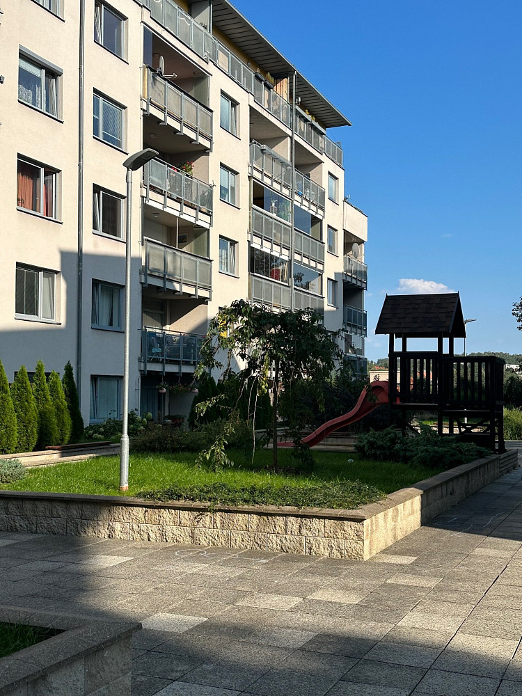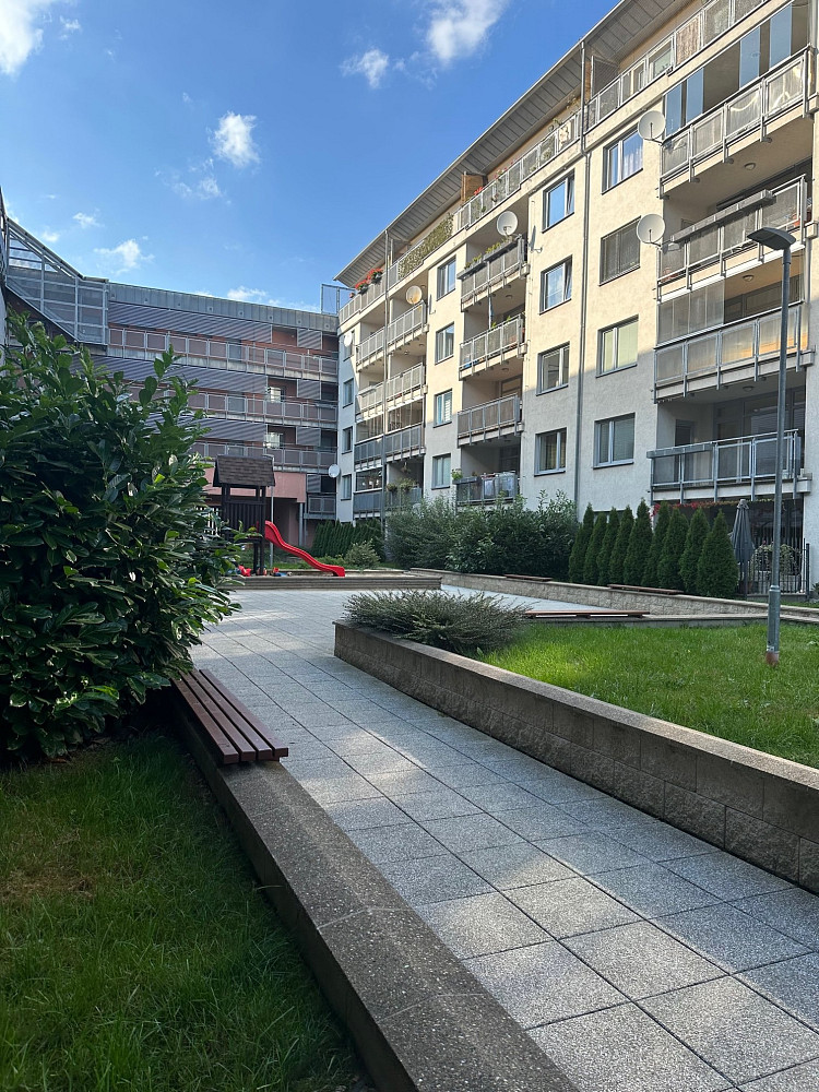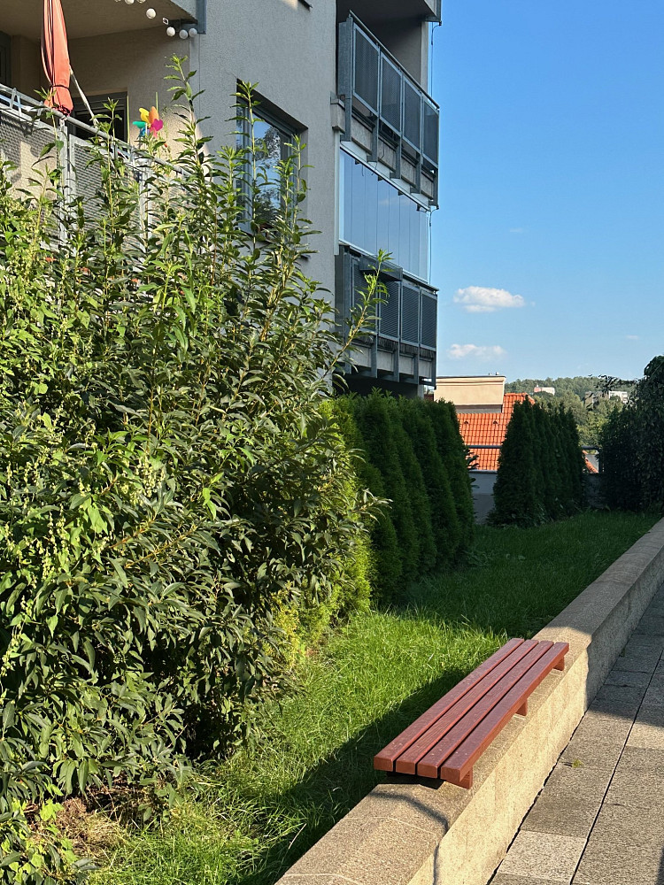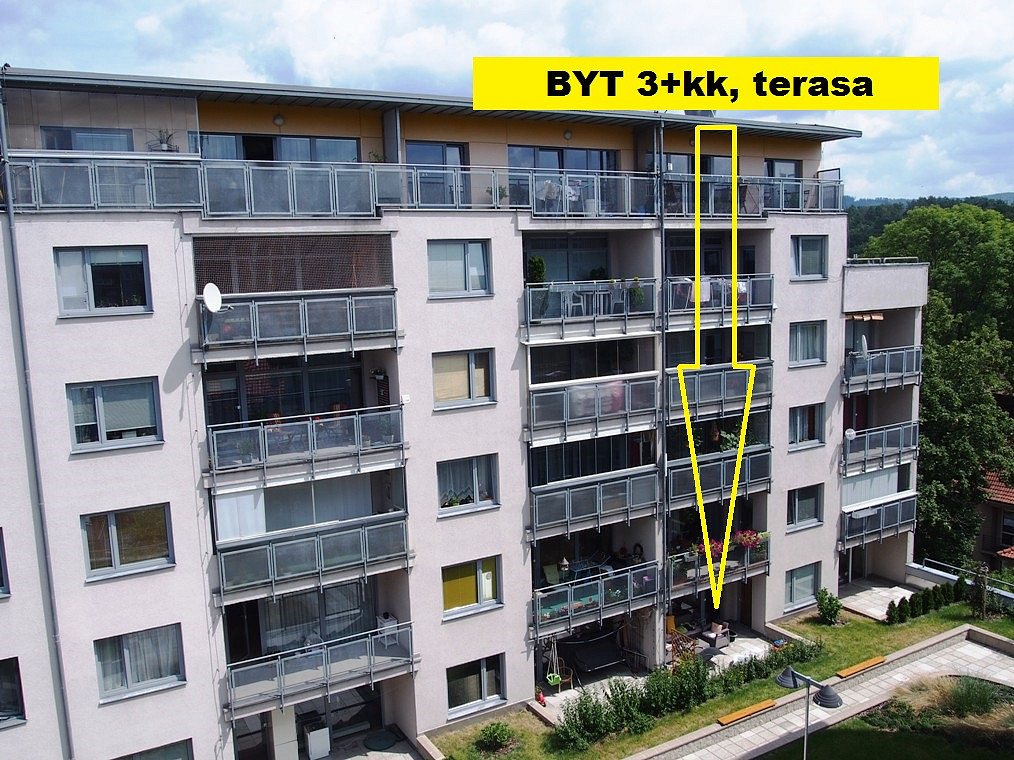 Dominantou bytu je velký obývací pokoj s vkusně řešeným kuchyňským koutem - rohová kuchyňská linka včetně spotřebičů (myčka, nová indukční varná deska a trouba, komínová digestoř, lednice s mrazákem, mikrovlnná trouba), součástí je barový pult. Aktuálně čistě bíle vymalováno, kvalitní plovoucí lamino podlaha / stáří 5 let, žaluzie, garnyže, svítidla. Nová koupelna i WC mají okna + koupelnový nábytek, vana, přípojka na pračku 600 mm / prostor pro sušičku. Jednoznačnou předností je bytová šatna - vybavena vestavěnou šatní skříní - nepostradatelný úložný prostor. Instalovány nové bezpečnostní dveře. Dominantou bytu je slunná terasa - osvětlena, venkovní dlažba, vstupy ze dvou pokojů - z obývacího pokoje celo prosklená stěna (28 m²) a z ložnice (15 m²), druhá ložnice (10 m²) neprůchozí, přístupná z předsíně. Terasa je úžasné místo jak pro vaše děti - možno doplnit malý bazén, houpací síť, snadný přístup na společnou venkovní terasu (pískoviště, klouzačka, zeleň); tak i pro vaši večerní sklenku dobrého vína.