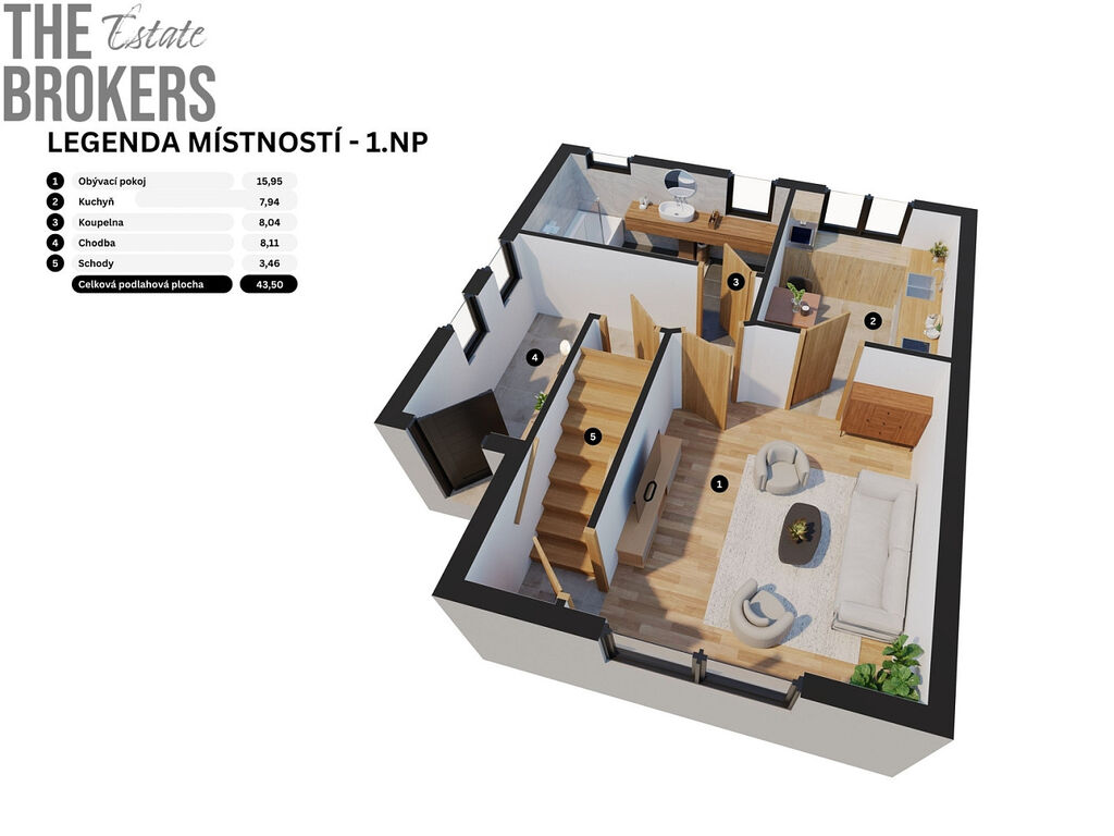 Podlahy byly vybudovány úplně od základů a nově je pokrývá kvalitní vinyl, který kombinuje praktičnost a vysokou odolnost. V kuchyni je připravená přípojka pro linku podle vašich představ, v obývacím pokoji najdete termostat i možnost připojení krbu.