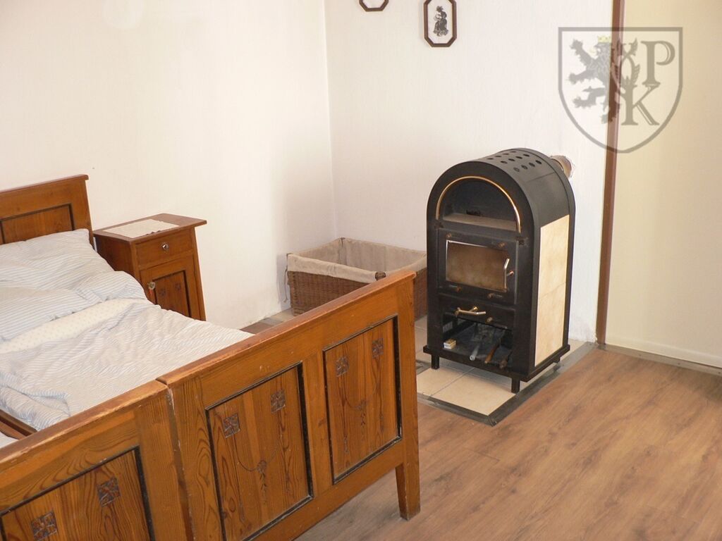 Topení: Lokální na tuhá paliva – krbová kamna, v kuchyni kachlový sporák.
