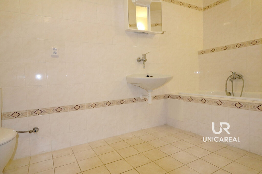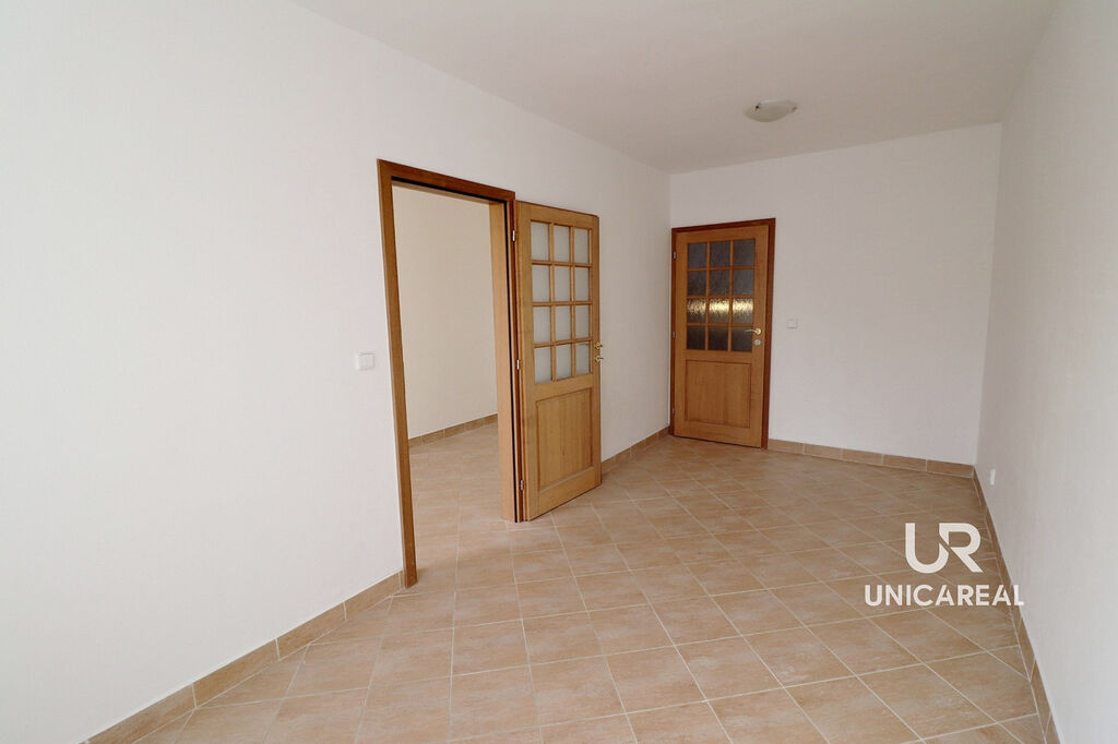 K bytu náleží i garáž. Byt je ve velmi dobrém udržovaném stavu a nabízí se jako částečně vybavený. Kuchyň 17 m² je zařízena vkusně zvolenou kuchyňskou linkou, sporákem, digestoří, myčkou nádobí a lednicí. Dominantní místností je prostorný obývací pokoj o velikosti 35 m². Ložnice v zadní části bytu má plochu 13,6 m² a menší pokojík 8,6 m² je se vstupem na balkon. Ve všech místnostech je položena dlažba. Koupelna 6 m² disponuje umyvadlem, vanou a toaletou a nachází se v mezipatře rodinného domu. K využití je také komora 1,8 m². V přízemí rodinného domu se nachází veterinární ordinace.