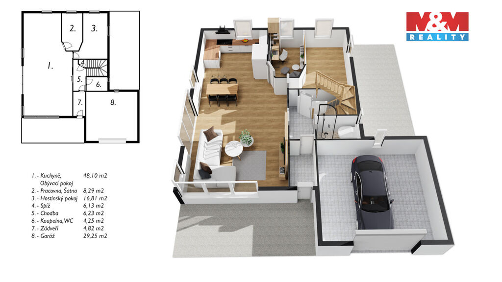 Nová snížená cena. Exkluzivně pro Vás k prodeji výjimečný rodinný dům v klidné části obce Mořina na Berounsku, jen pár minut od okraje Prahy. Tento samostatně stojící dům, situovaný v nádherné lokalitě, je ideální pro vícegenerační bydlení či klidný rodinný život. Nemovitost se rozkládá na pozemku o velikosti 1302 m² a nabízí prostornou užitnou plochu 240 m². Dům má dvě nadzemní podlaží a jedno podzemní, celkem 6 místností, včetně průchozí šatny a komory. Velké a světlé pokoje poskytují jedinečný výhled do okolní malebné krajiny. K dispozici je také sklep a prostorná garáž s dílnou. Obývací pokoj má přímý vstup na zahradu o rozloze více než 1000 m². V obci a blízkém okolí je dostupná veškerá občanská vybavenost. Skvělá investice díky velikosti pozemku a unikátní poloze. Využijte jedinečnou šanci bydlet v přírodě, klidu a přesto na dosah všeho, co potřebujete k modernímu bydlení. Velmi rádi také pomůžeme s financováním od našeho specialisty. Těšíme se na Vás v obci Mořina na Berounsku.
