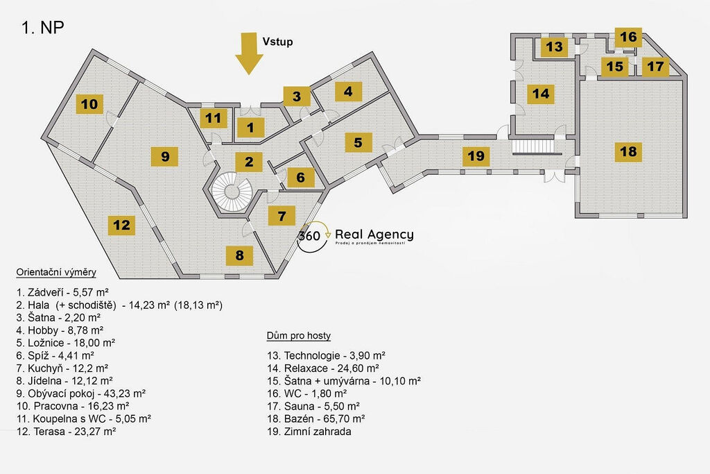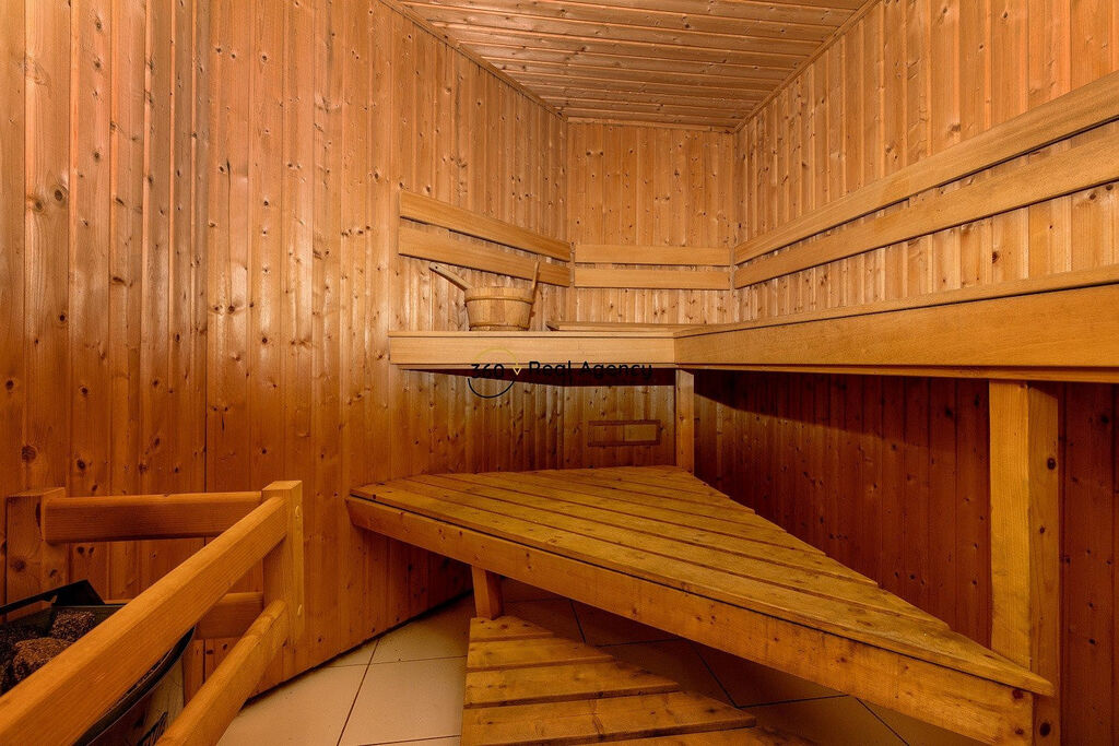 V přízemí relaxační wellness zóna s bazénem, saunou a krbem