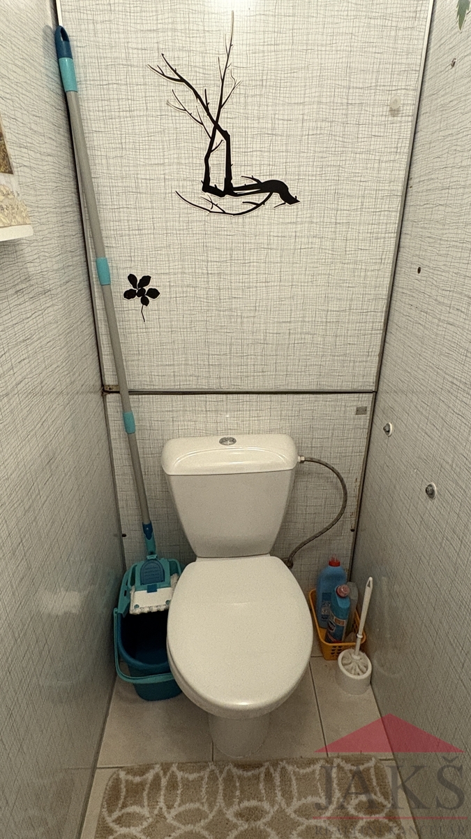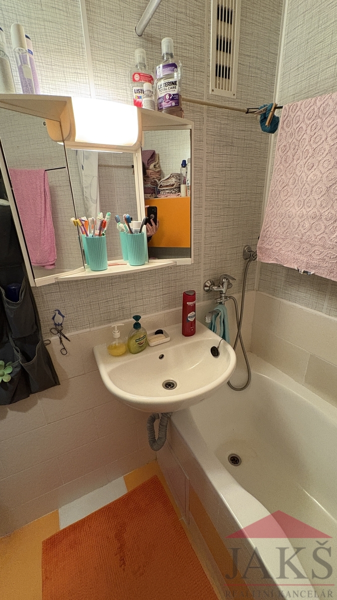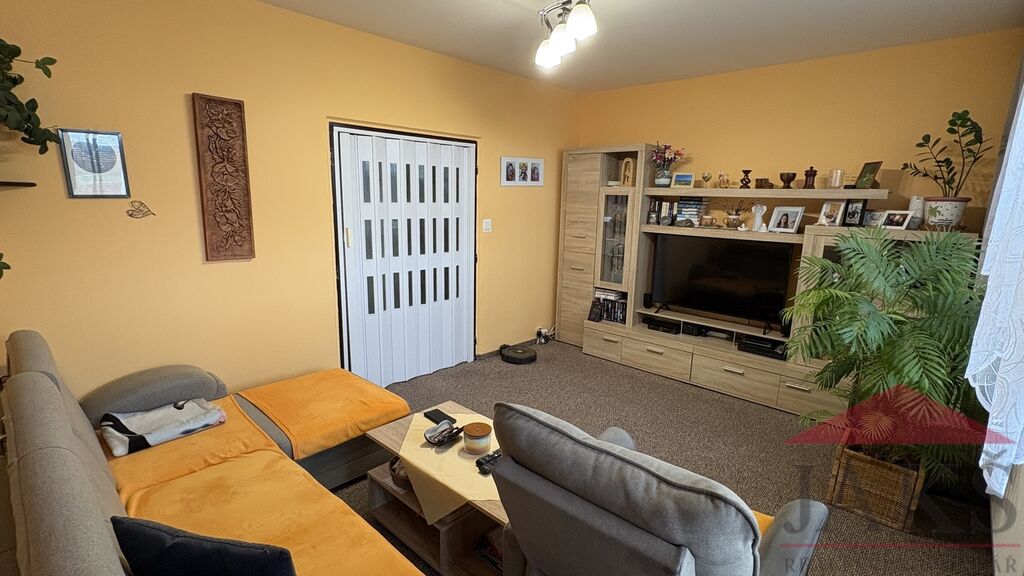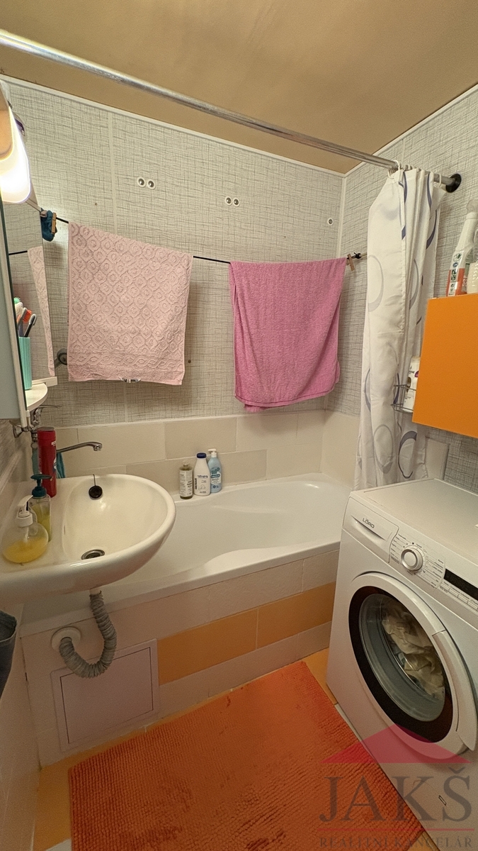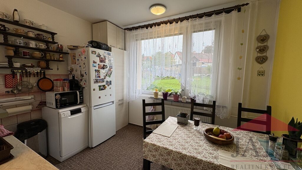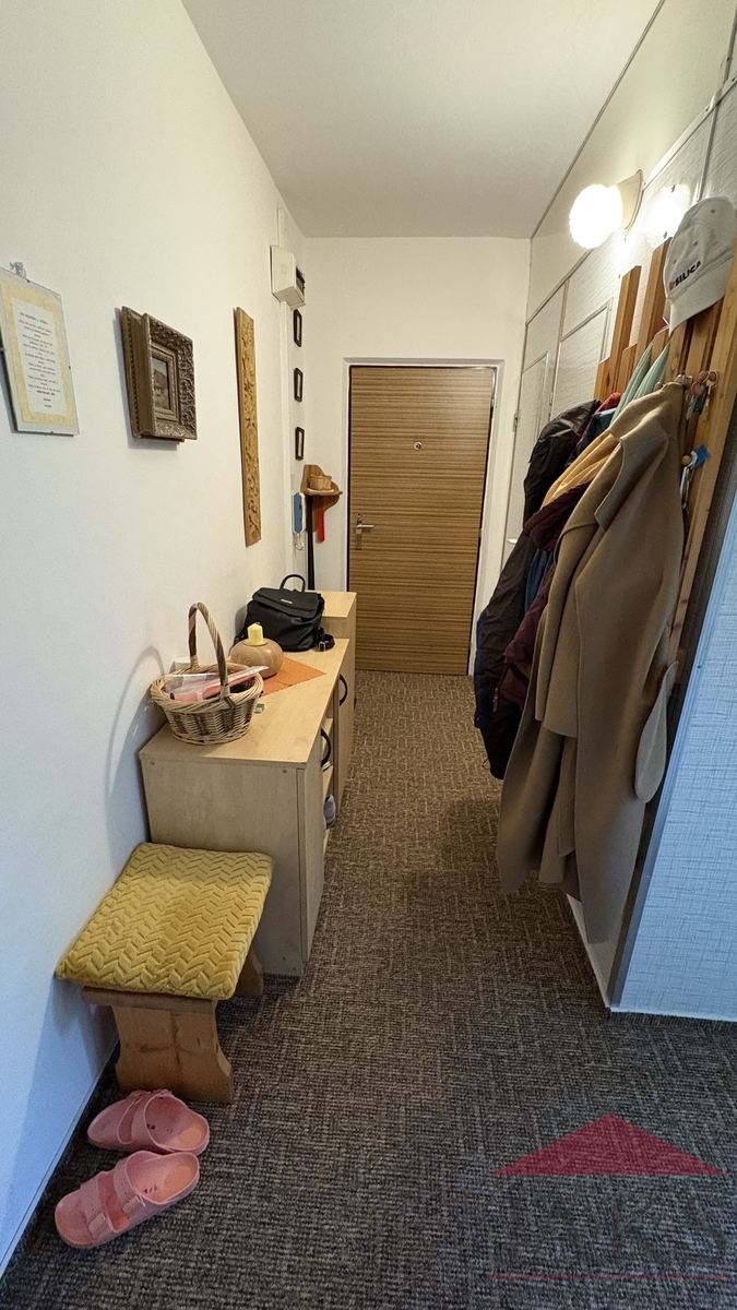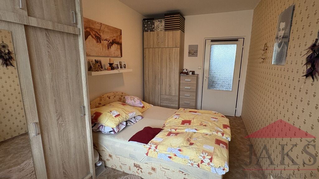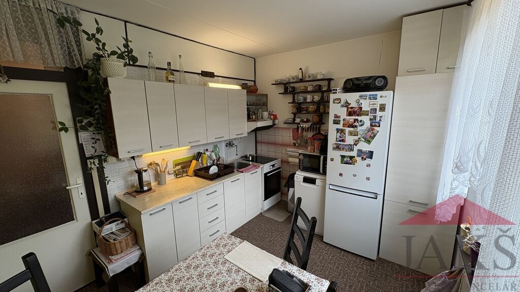 Popis: centrální chodba 10,35 m2 (šatní skříně) s šatnou, koupelna 2,6 m2 (nová sanita: vana, umyv. se zrcadlem, vývody na pračku), sam. WC 1 m2 (rozvody vody a odpadu v plastu), kuchyň 10,2 m2 (kuch. linka s HV troubou se sklo-ker. deskou a digestoří) s jídelnou, obývací pokoj 16,4 m2 se zasklenou lodžií s posezením a 2x ložnice (12,1 m2 a 8,8 m2).
