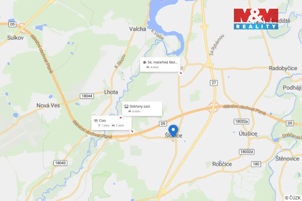 Zahrada je celá obrostlá zelení a poskytuje naprosté soukromí. Za domem se nachází terasa ideální pro letní posezení, altánek a nádherné koupací jezírko, které dodává místu klid i kouzlo. Obec Šlovice nabízí klidné bydlení s výbornou dostupností – 5 min na D5 a jen 8 min do Plzně. Veškerá občanská vybavenost je v Dobřanech, vzdálených 5 min autem.