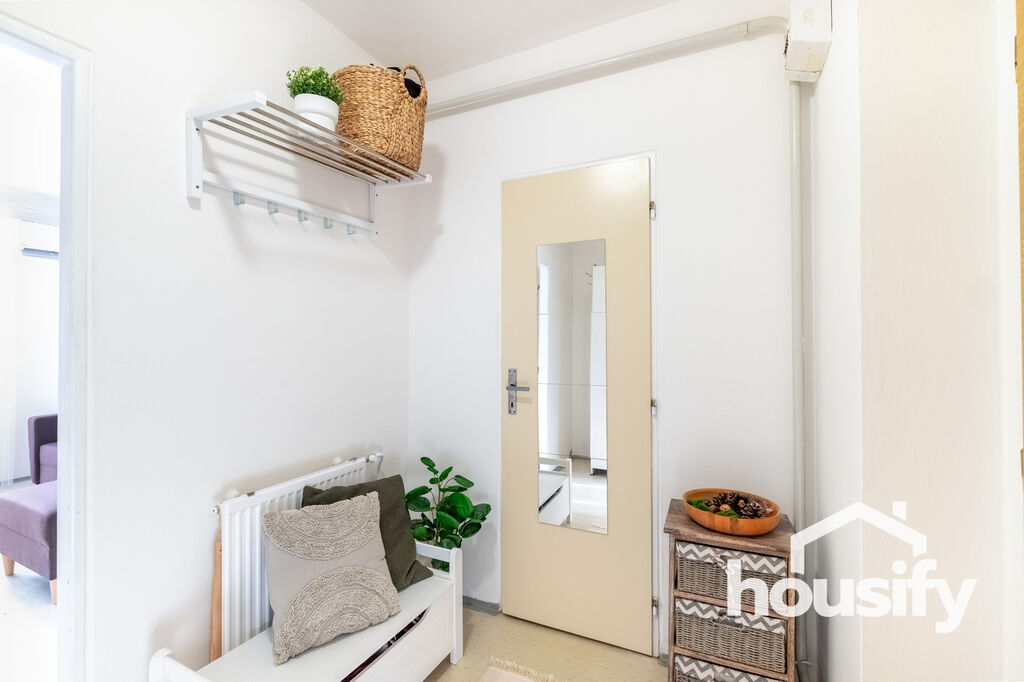 Součástí vybavení je kuchyňská linka se sporákem a digestoří, spižírna, úložná skříň, vlastní plynový kotel pro vytápění i ohřev vody a také nová klimatizace, která zpříjemní bydlení v horkých dnech. V bytě jsou plastová okna a nové balkonové dveře.