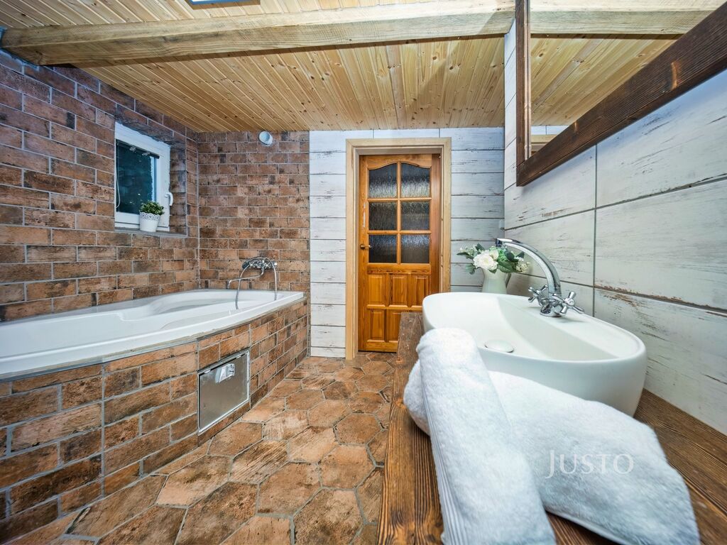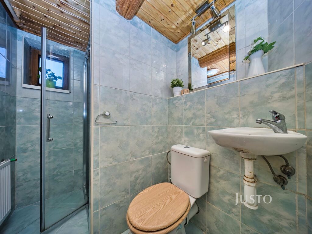V přízemí domu je také koupelna, kde je vana i sprchový kout a umyvadlo. Toaleta je v přízemí řešena samostatně. Za koupelnou jsou i úložné prostory pro skladování potravin.