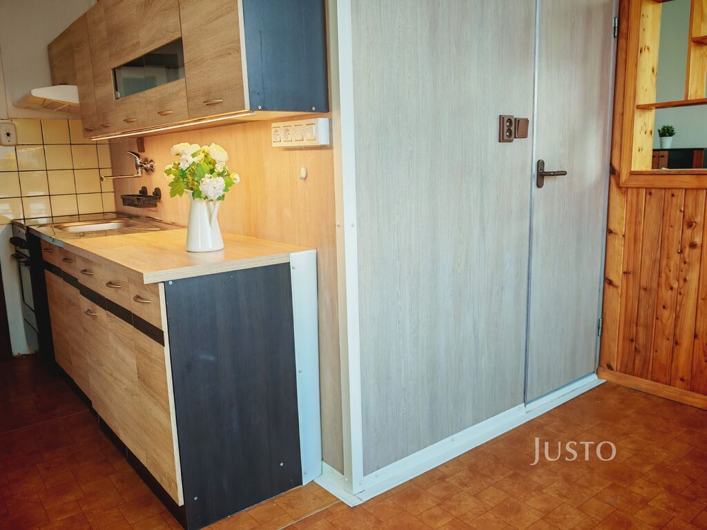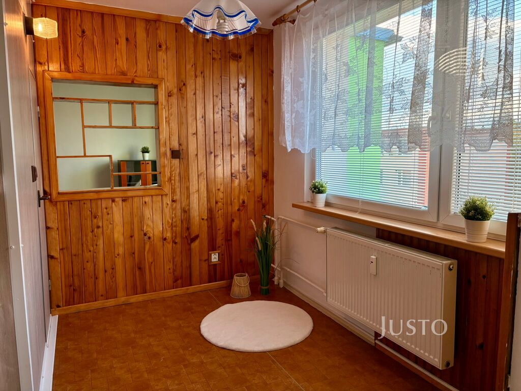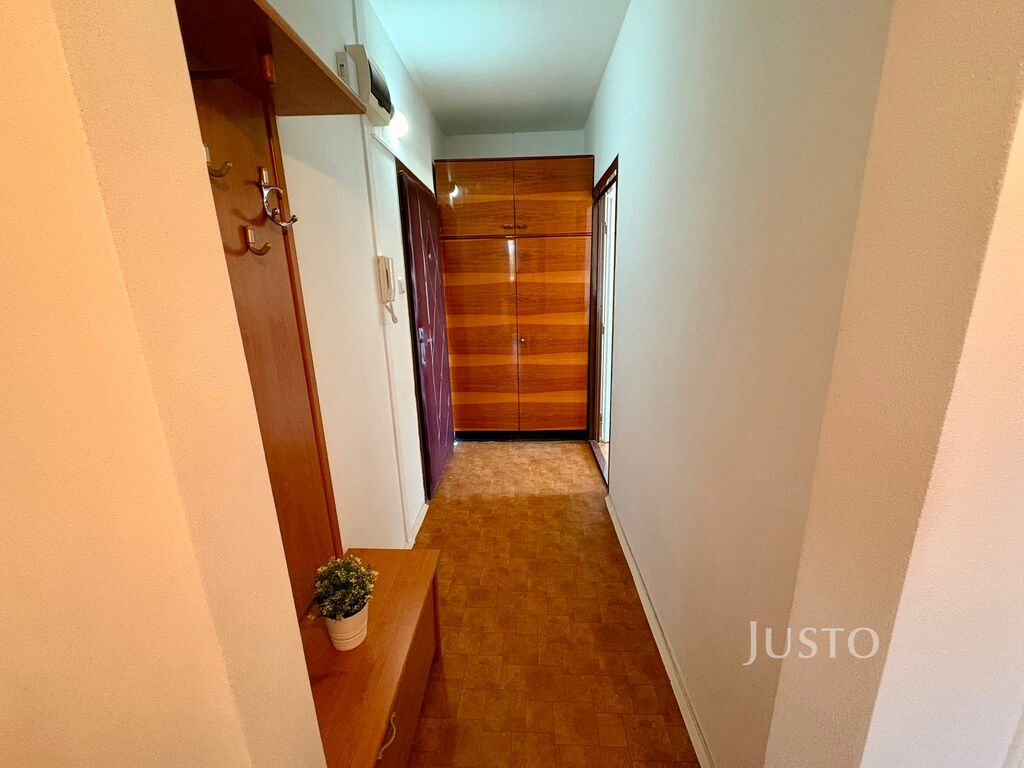 Prostorná předsíň s úložným prostorem. Obývací pokoj je dostatečně velký a má k dispozici balkon, ideální pro ranní kávu nebo večerní posezení. Kuchyně s linkou, elektrickým sporákem s troubou a velkou jídelnou, dále dvě samostatné ložnice, šatna nebo komora pro uložení věcí. V koupelně je vana a umyvadlo. WC je řešeno samostatně. Na chodbě je další oddělená komora pro uložení věcí.
