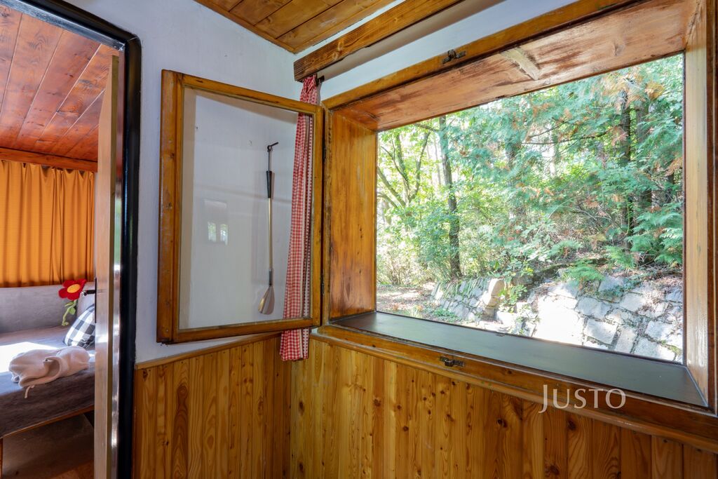 Podlahy jsou betonové, okna, dveře i stropy dřevěné, za chatou se nachází kůlna a suchý záchod umístěný v lese. Pod chatou jsou také úložné prostory vhodné na nářadí či dřevo.